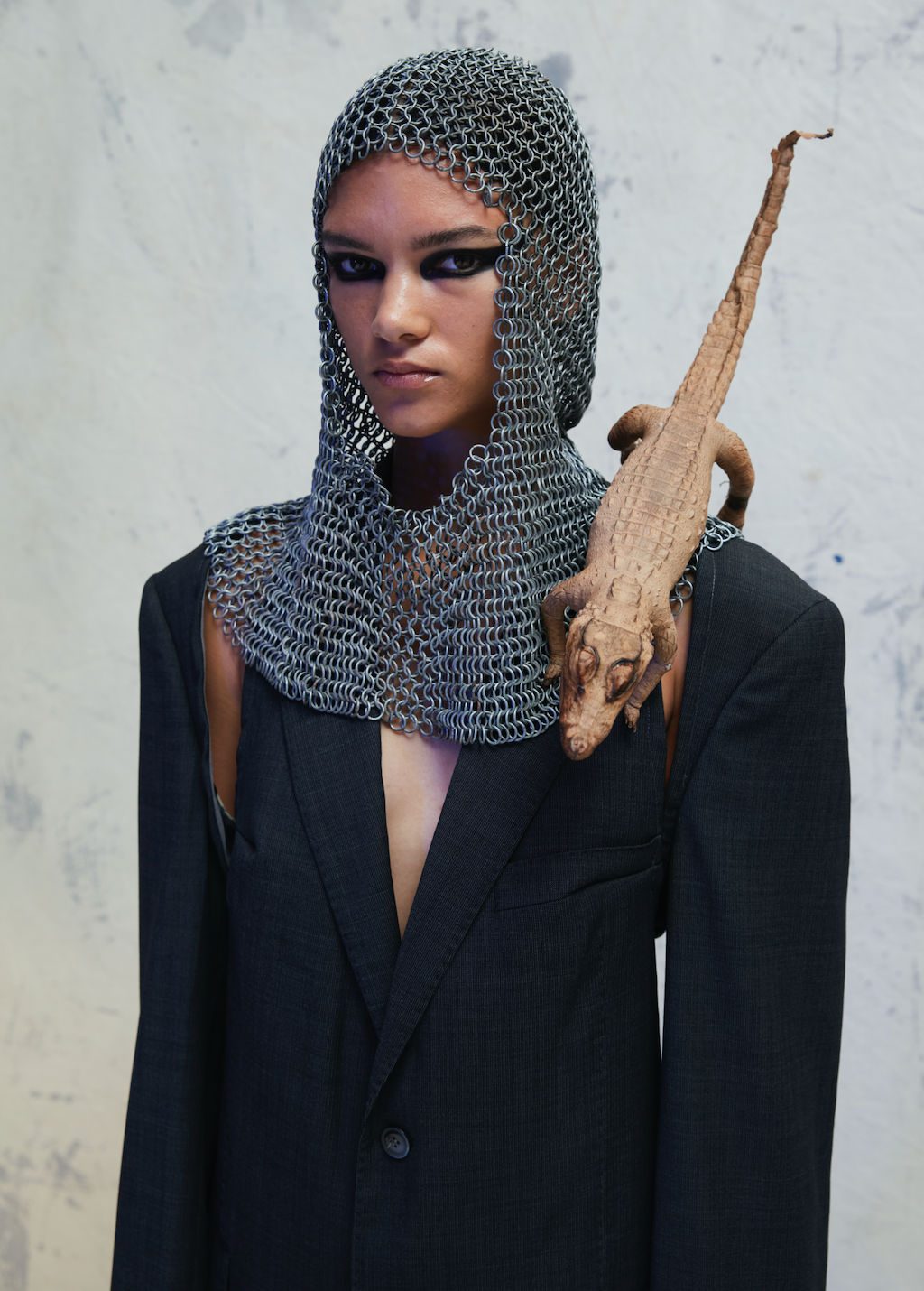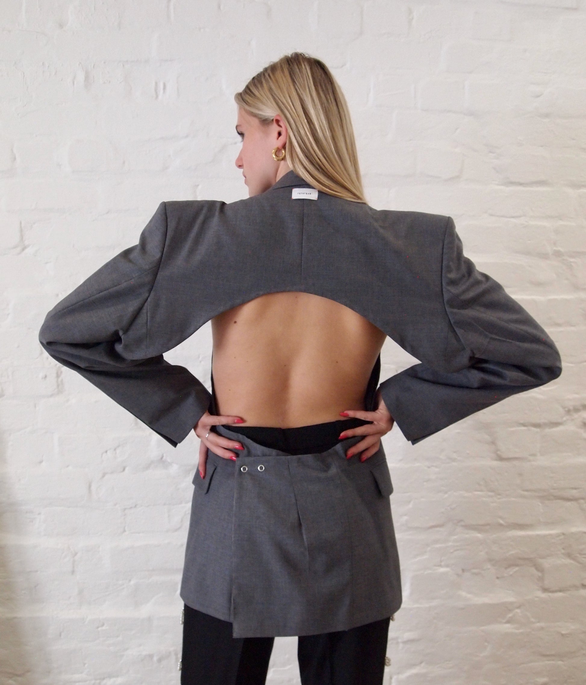 Our Earthquake Blazer is upcycled from a menswear blazer. It features cut-out details, an open back, and 2 sets of press studs at the back to provide two different sizing options for a comfortable fit. This piece is super versatile & can be worn as a jacket with your favorite pair of pants or with biker shorts/tights as more of a blazer 'dress'.Â