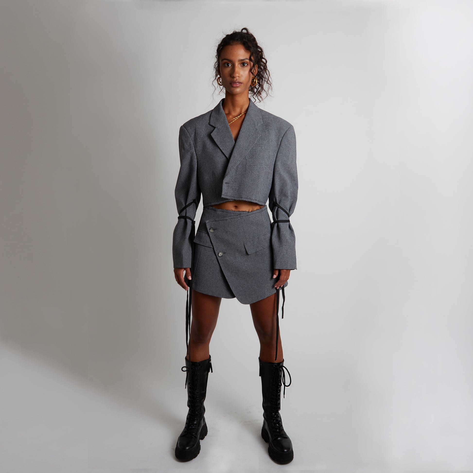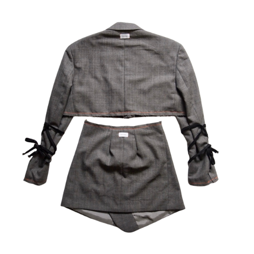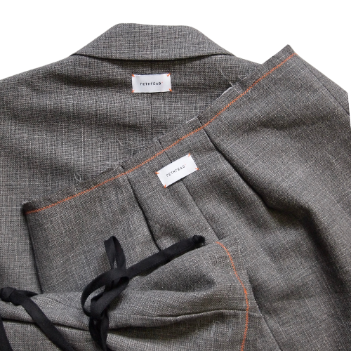Blend masculine and feminine energies in the Equinox Suit Set, part of our Redesigned (Upcycled) collection. Repurposed from previously worn men's blazers, each set is one of a kind and can be worn paired or as separates. Raw edges with criss-cross stitch in orange create an "unravelled" effect, while the cropped jacket features a "ribbon wrap" (removable and adjustable) around the sleeves. The Rethread label with our signature orange stitch is visible on the back of the jacket & skirt.Â