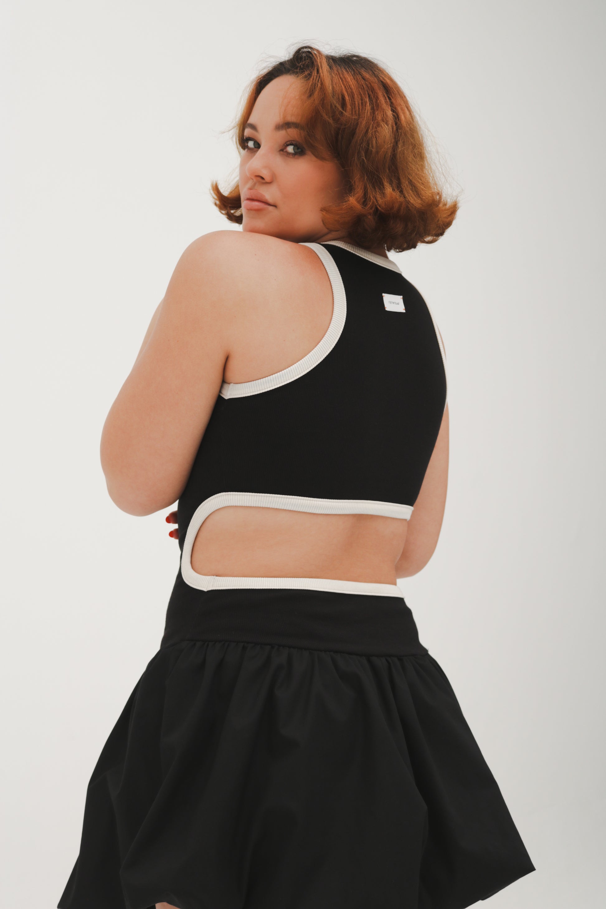 A stylish black dress with cream accents. It has a drop waist tank-style top, a bubble mini skirt, and a unique open-back design. This dress is easy to wear and can be dressed up or down for various occasions. It's your go-to choice for looking great and feeling comfortable.