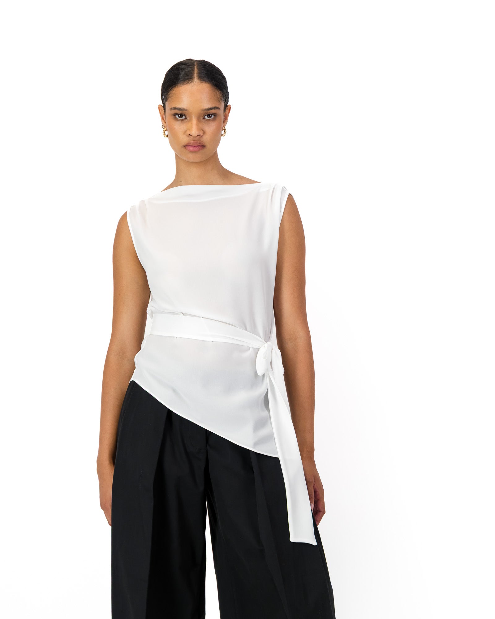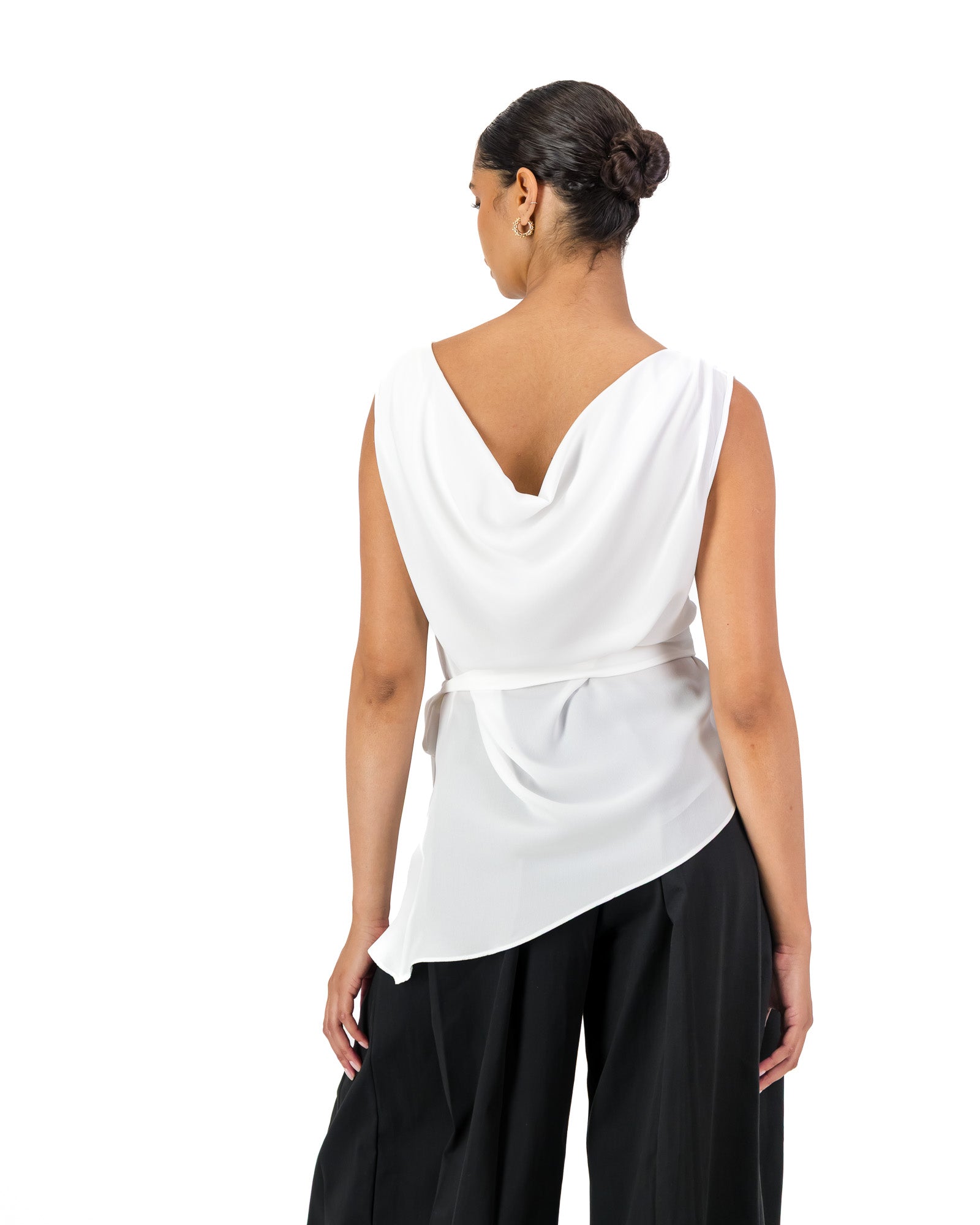 A summer staple in slightly sheer & breathable georgette, this top features side ties to cinch the waist and an asymmetric hemline. With the classic Rethread twist, it’s fully reversible - wear it one way for a boat neckline, or flip it for a romantic drape (on or off the shoulder!)