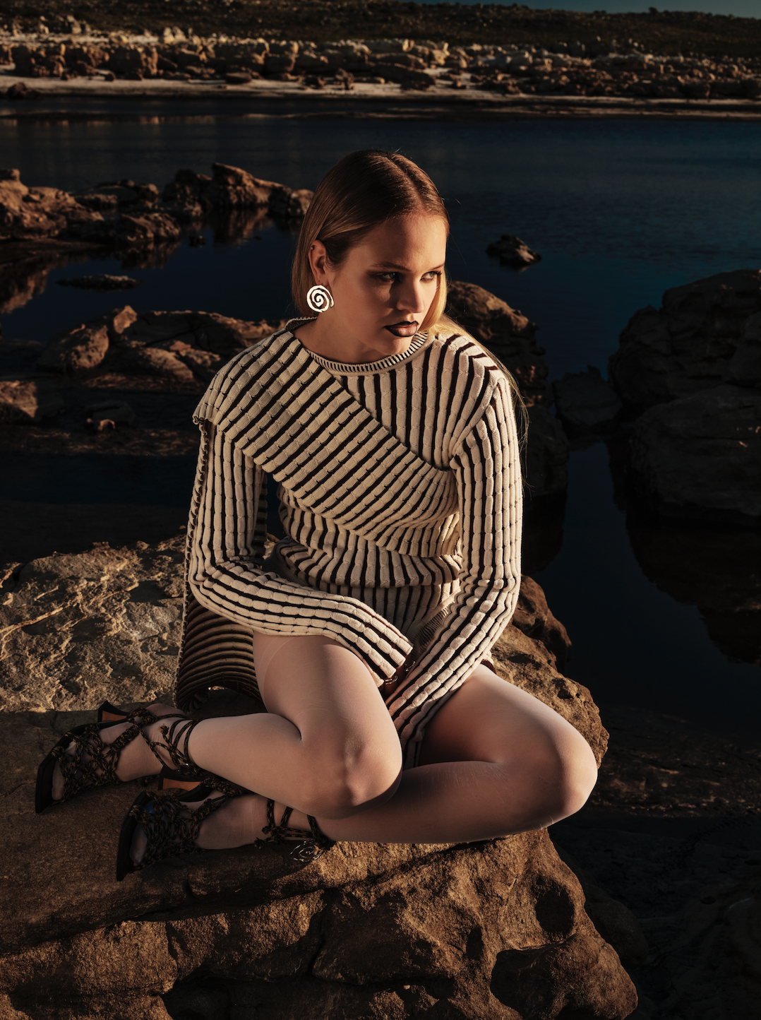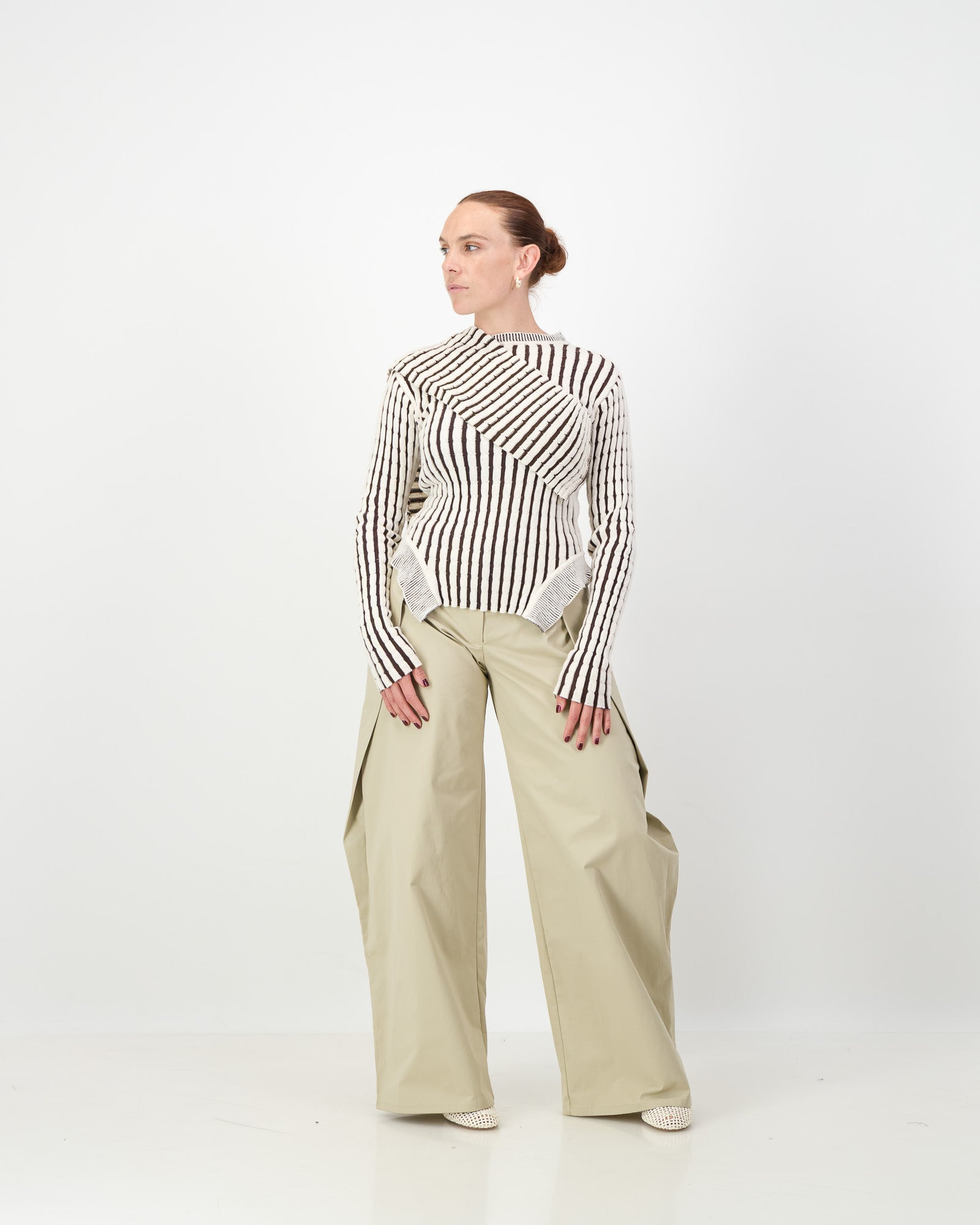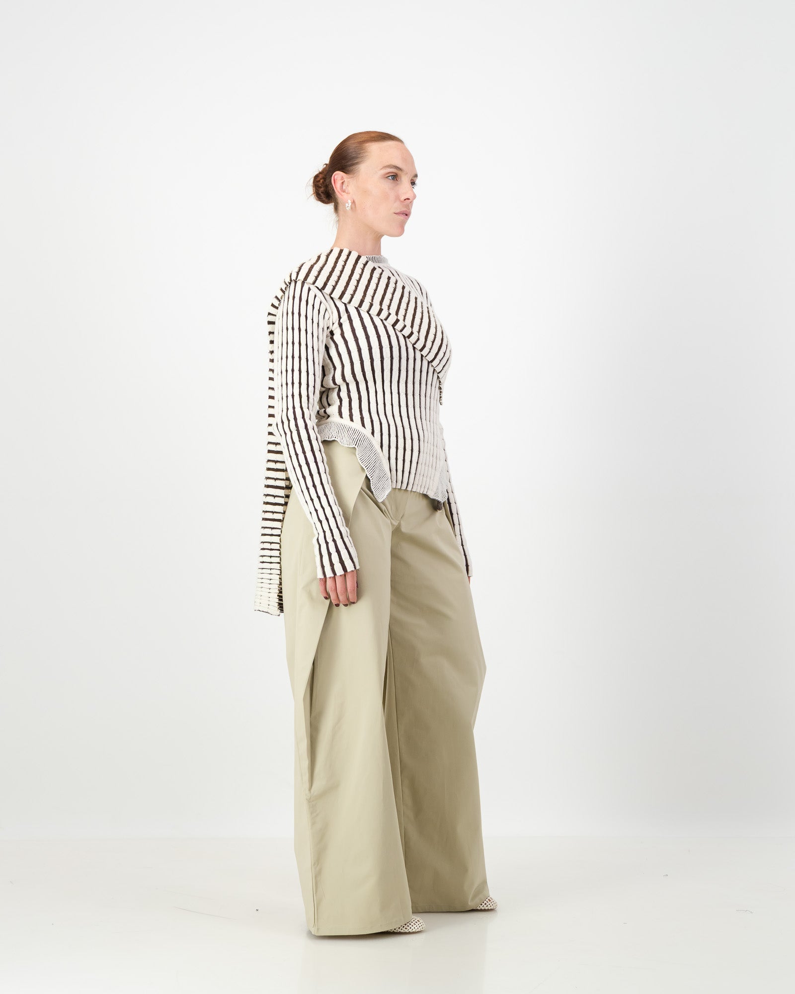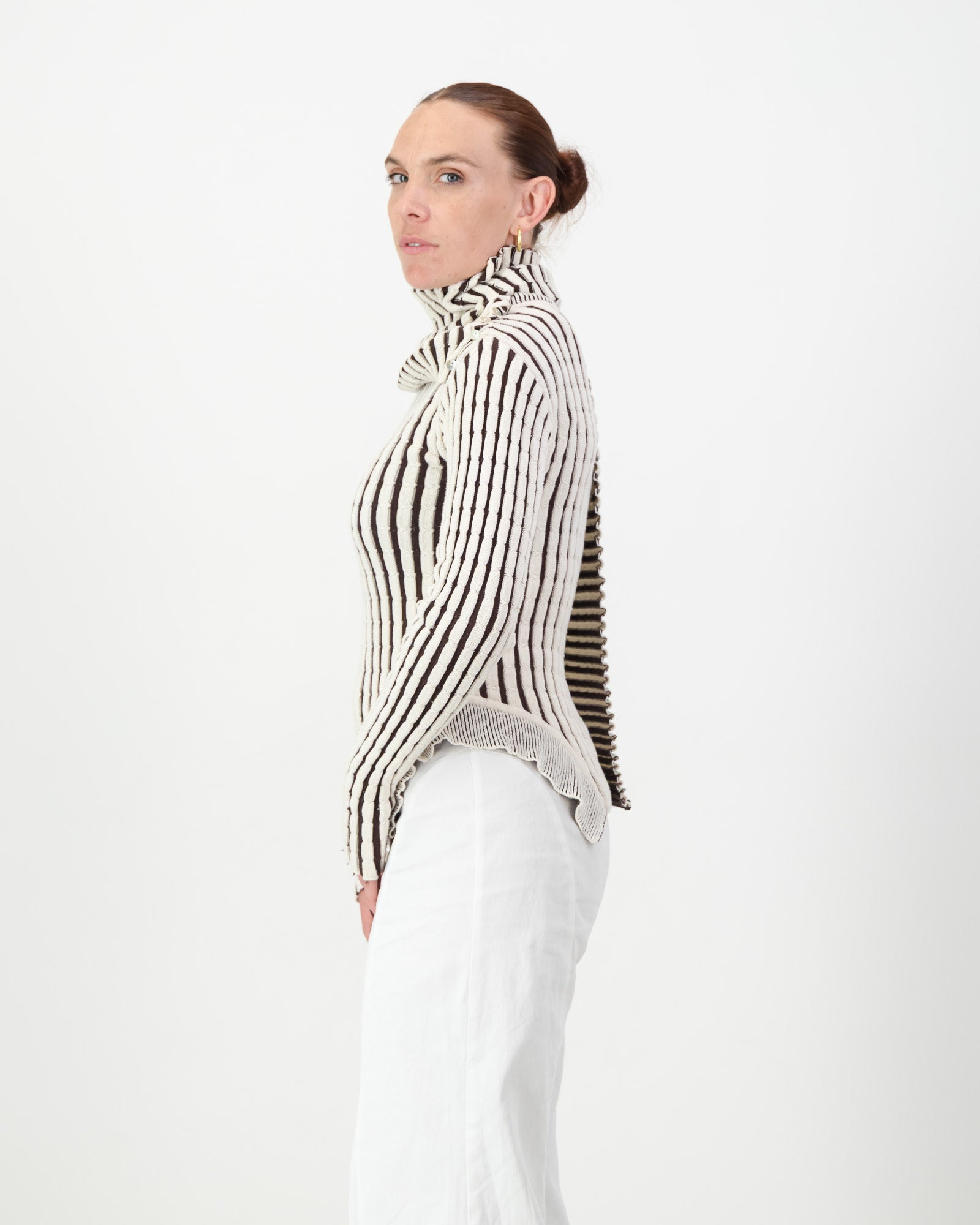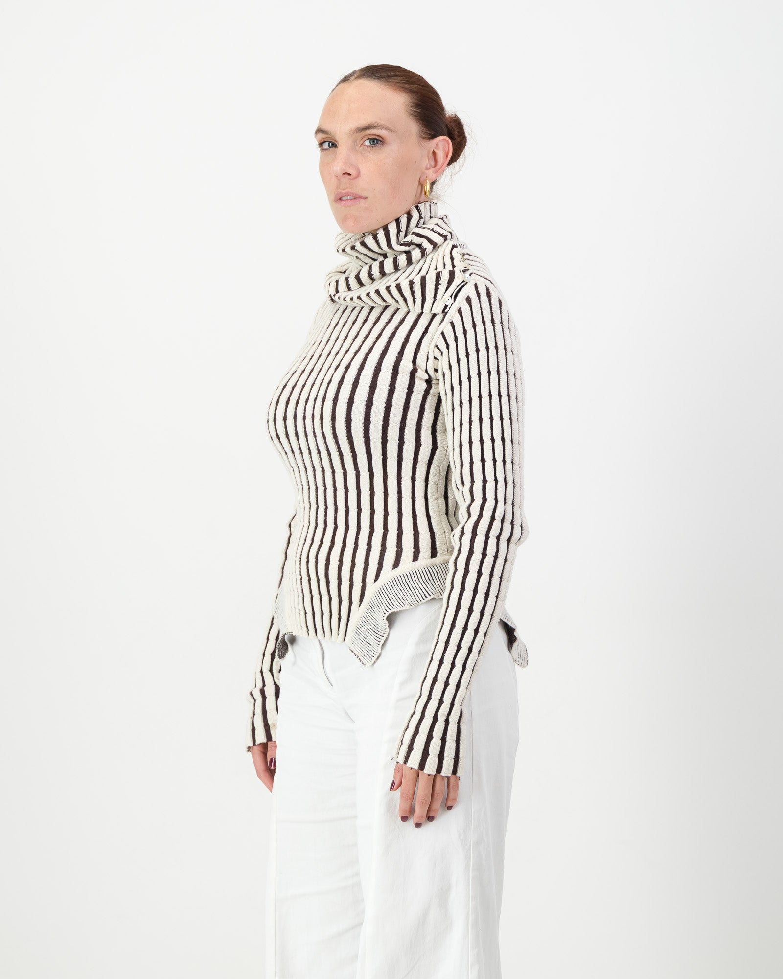 A long-sleeve knit top with a removable scarf detail, designed for versatile styling. The scarf attaches with shell buttons through loops on the shoulder and side seam—wear it together, separately, or styled your way. Features a structured silhouette with curved detailing at the hips to accentuate the form. Knitted in Cape Town from 100% South African cotton in small batches. Sold as a set (scarf also available separately).