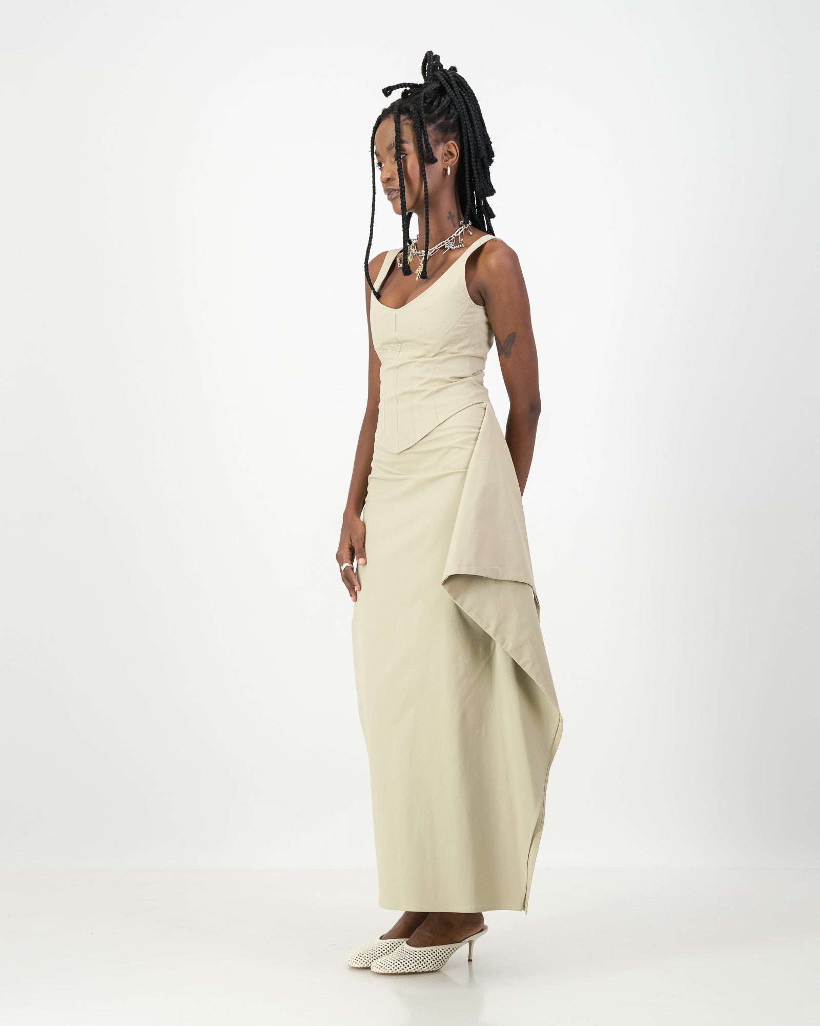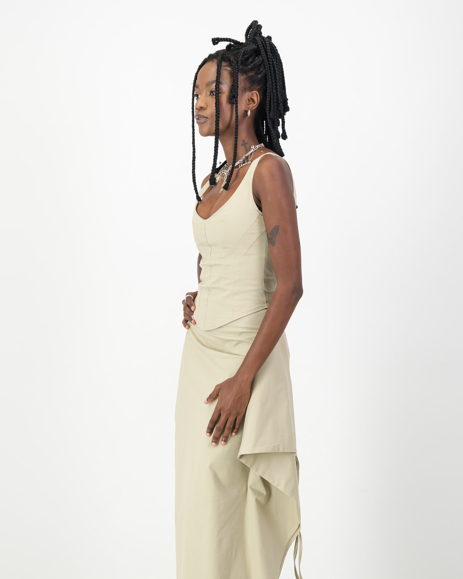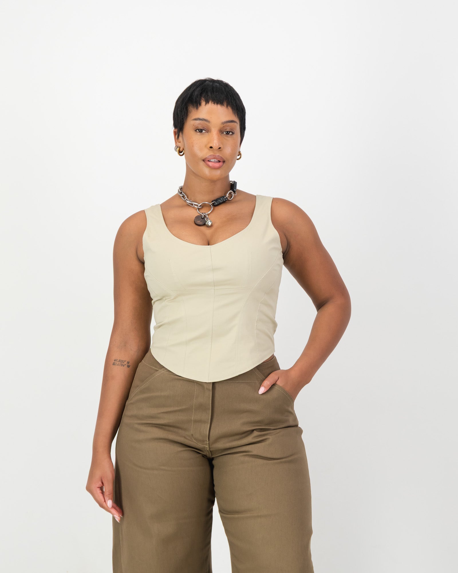 A soft-structured, lined corset with no boning, designed for comfort and shape. Features panelled lines with subtle underbust detailing, curved straps, and a scooped neckline. Finished with a zip closure at the back. Available in stone and black. Pair it with the Noir Skirt for a complete set.