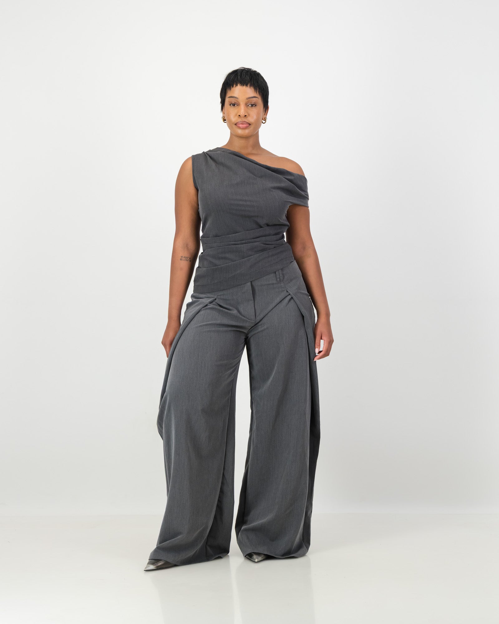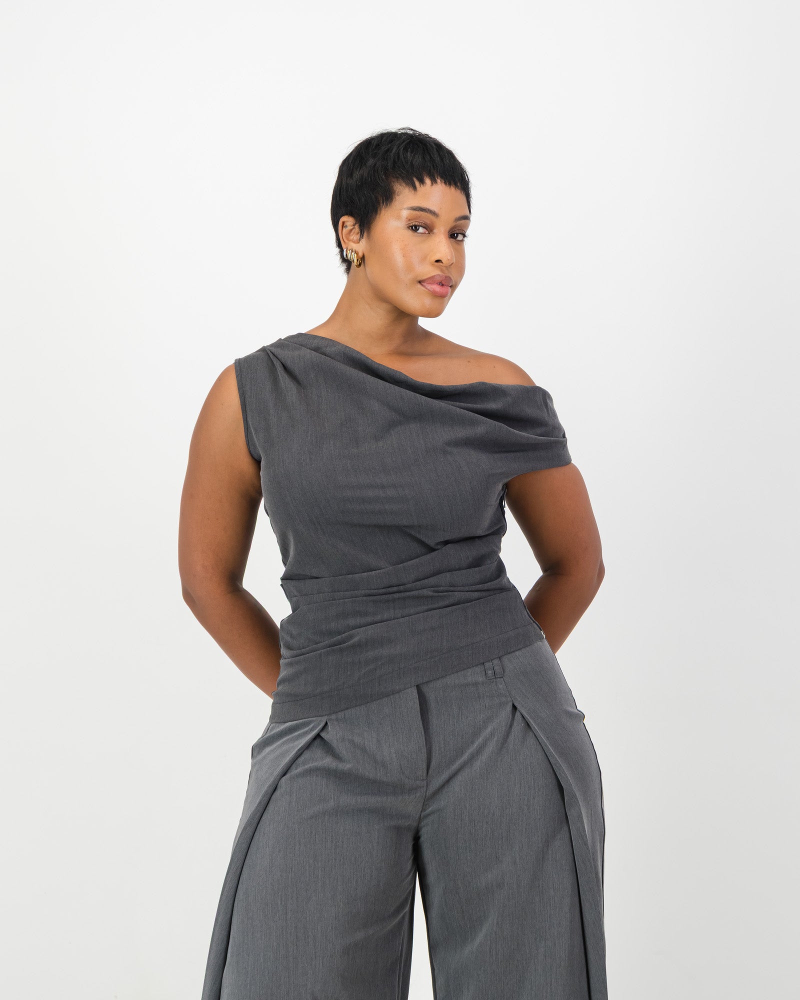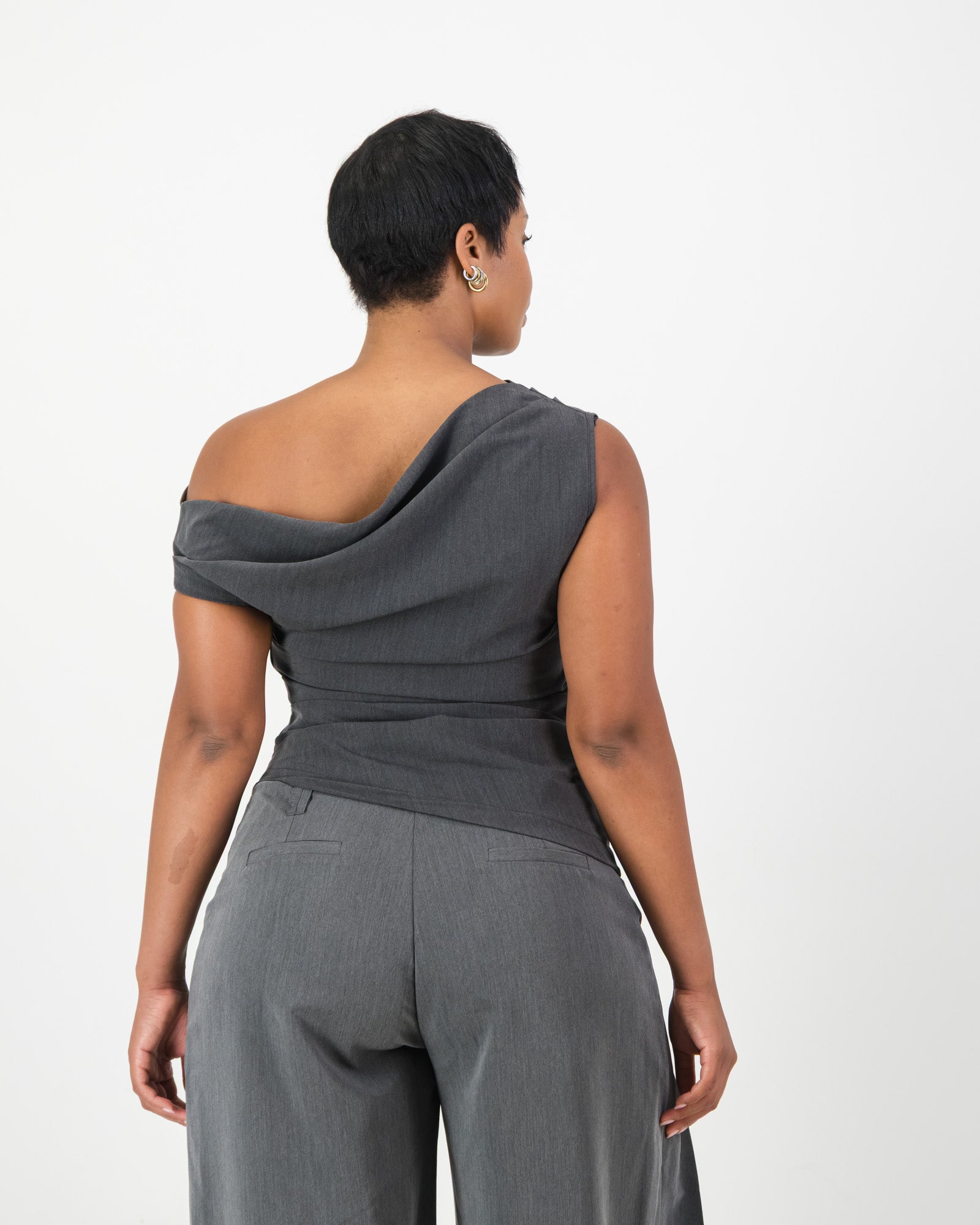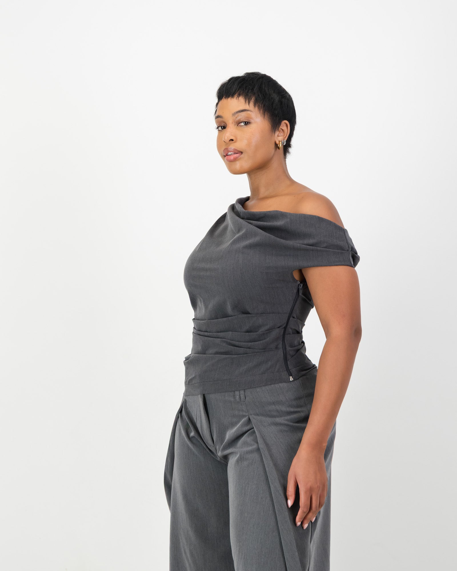 Off-the-shoulder top with structured draping across the waist and neckline, finished with an asymmetric hem. Side zip closure for ease. Made in soft suiting and available in grey marle and black. Pairs perfectly with the Arc Trousers or Dune Shorts if you are looking for the perfect co-ord set.Â