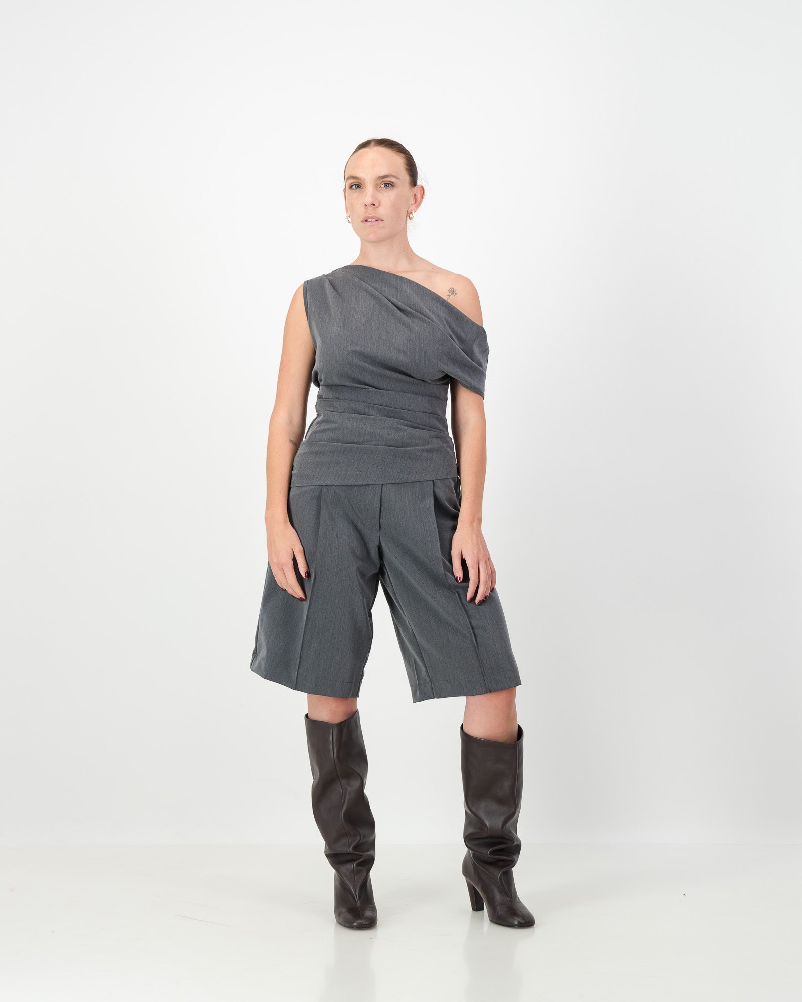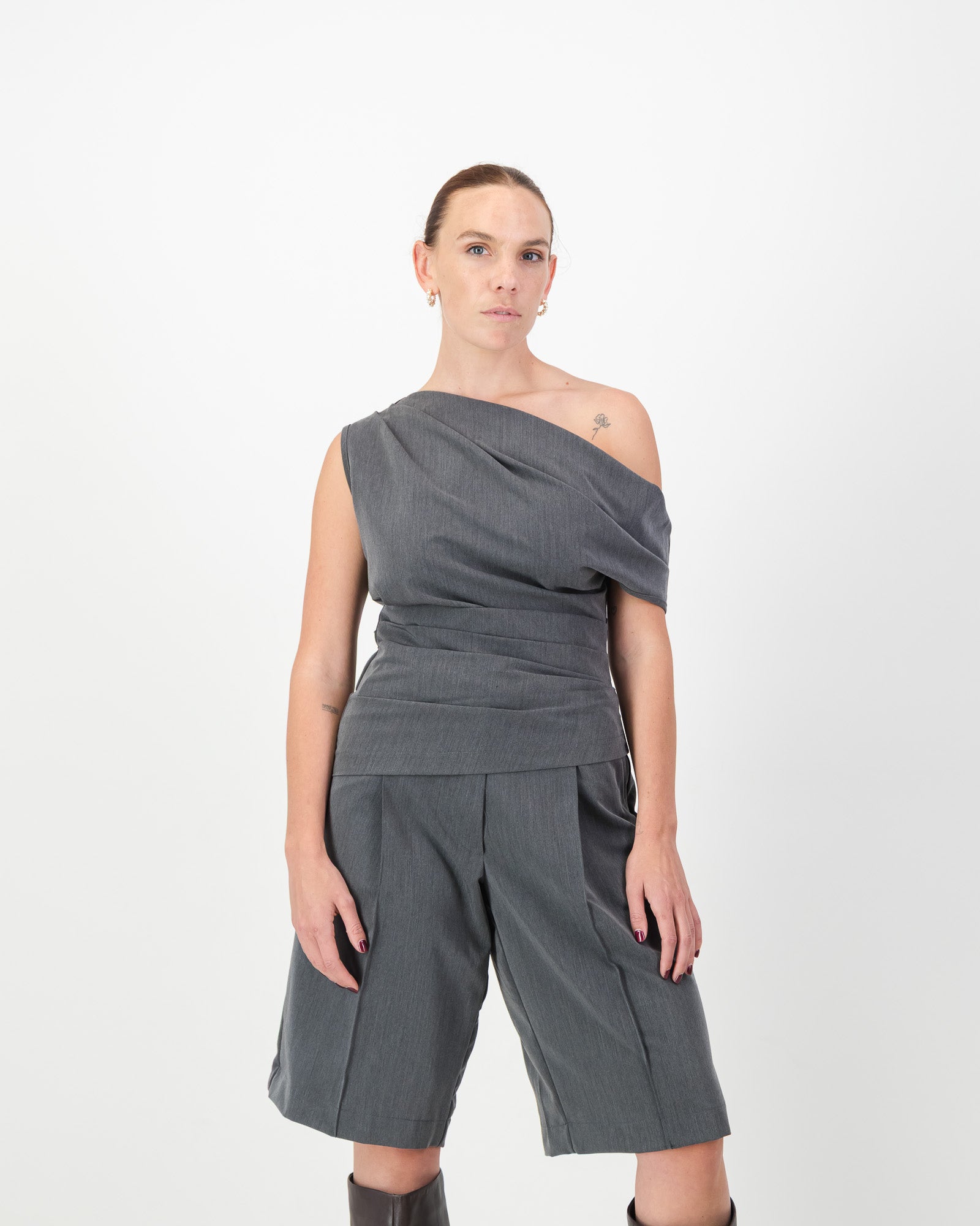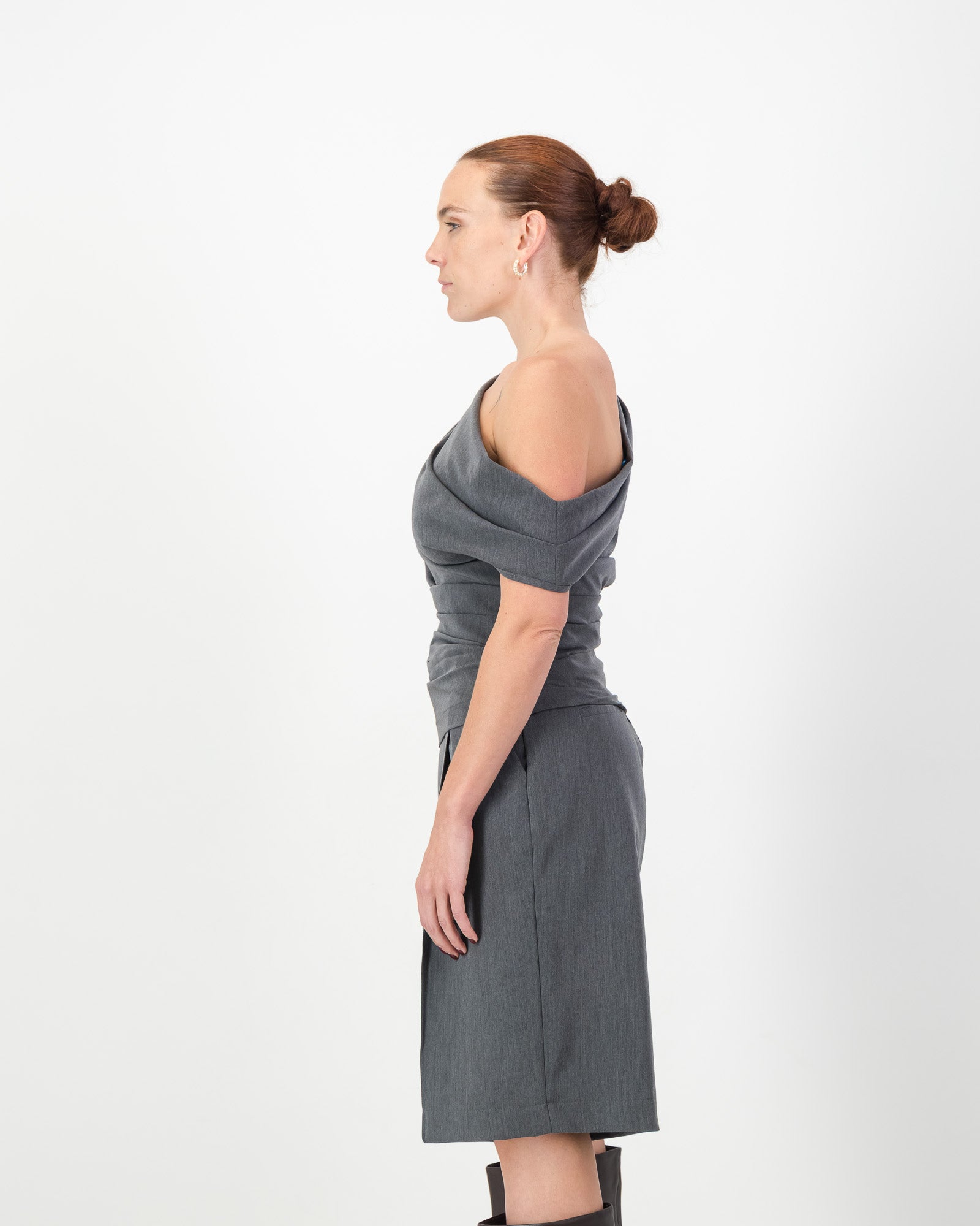 Off-the-shoulder top with structured draping across the waist and neckline, finished with an asymmetric hem. Side zip closure for ease. Made in soft suiting and available in grey marle and black. Pairs perfectly with the Arc Trousers or Dune Shorts if you are looking for the perfect co-ord set.