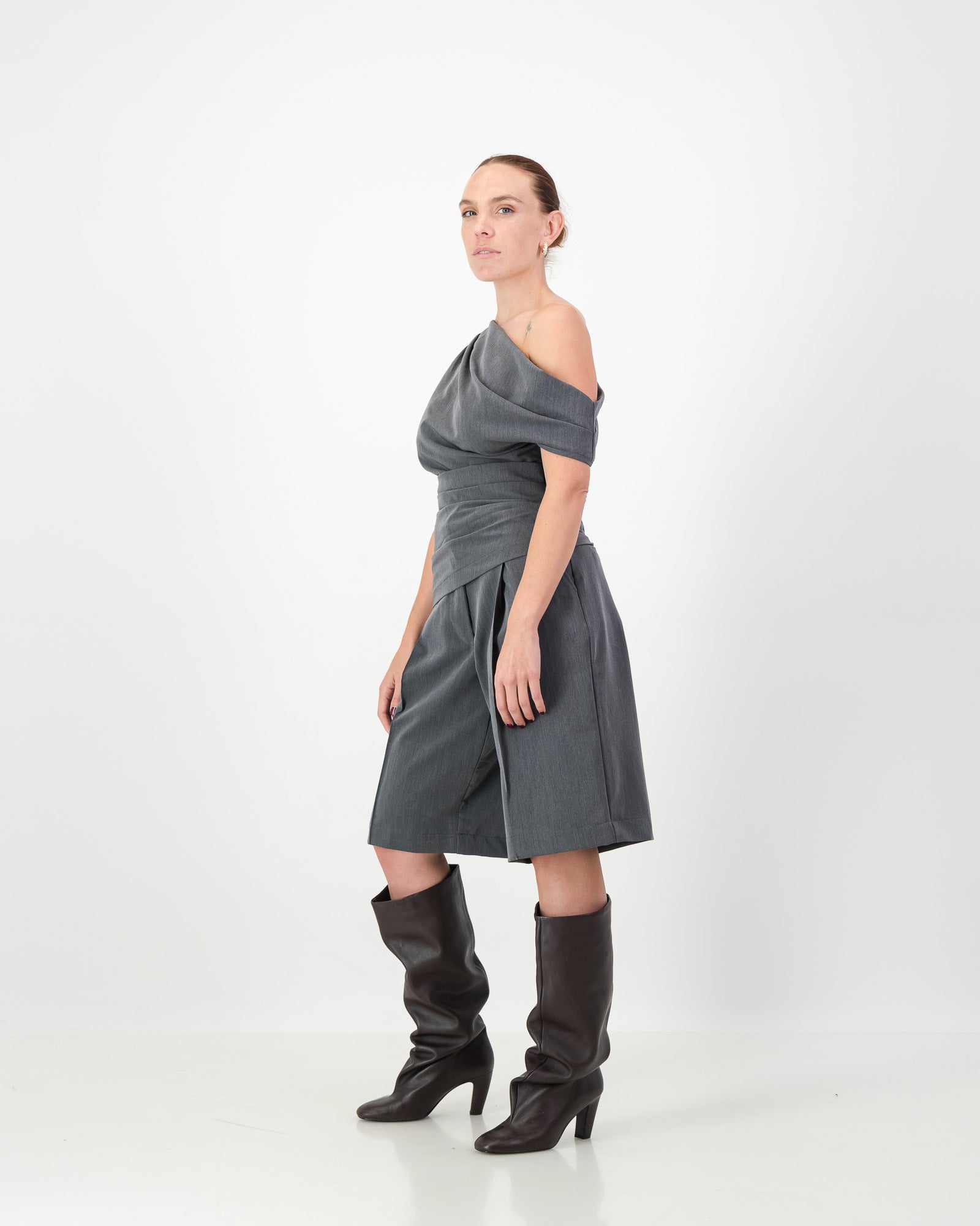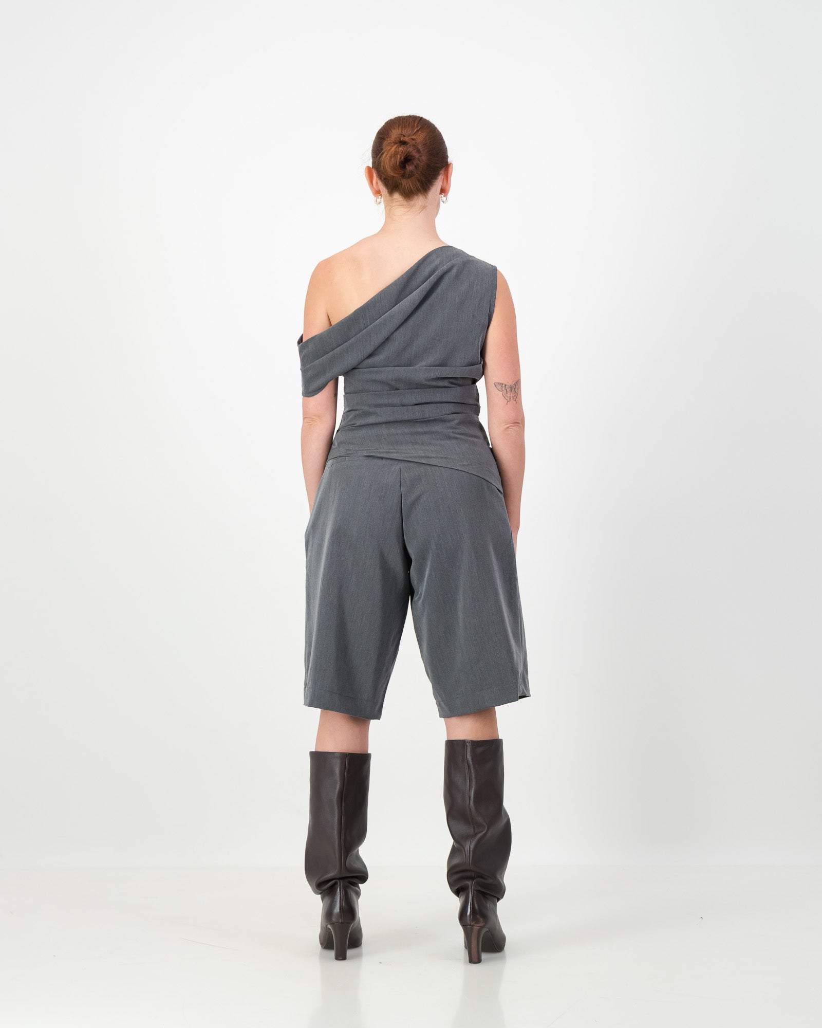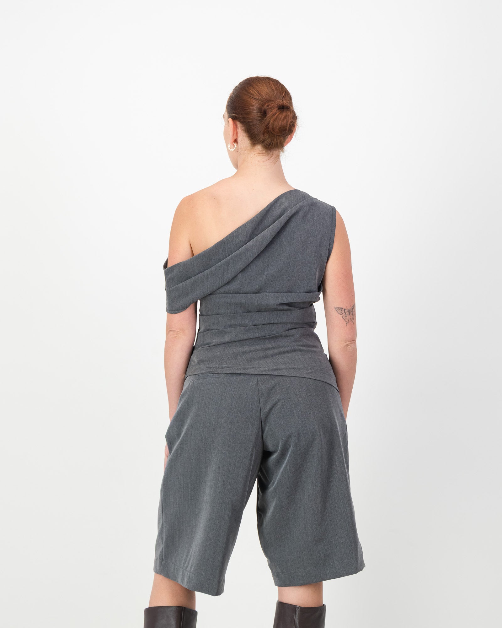Off-the-shoulder top with structured draping across the waist and neckline, finished with an asymmetric hem. Side zip closure for ease. Made in soft suiting and available in grey marle and black. Pairs perfectly with the Arc Trousers or Dune Shorts if you are looking for the perfect co-ord set.