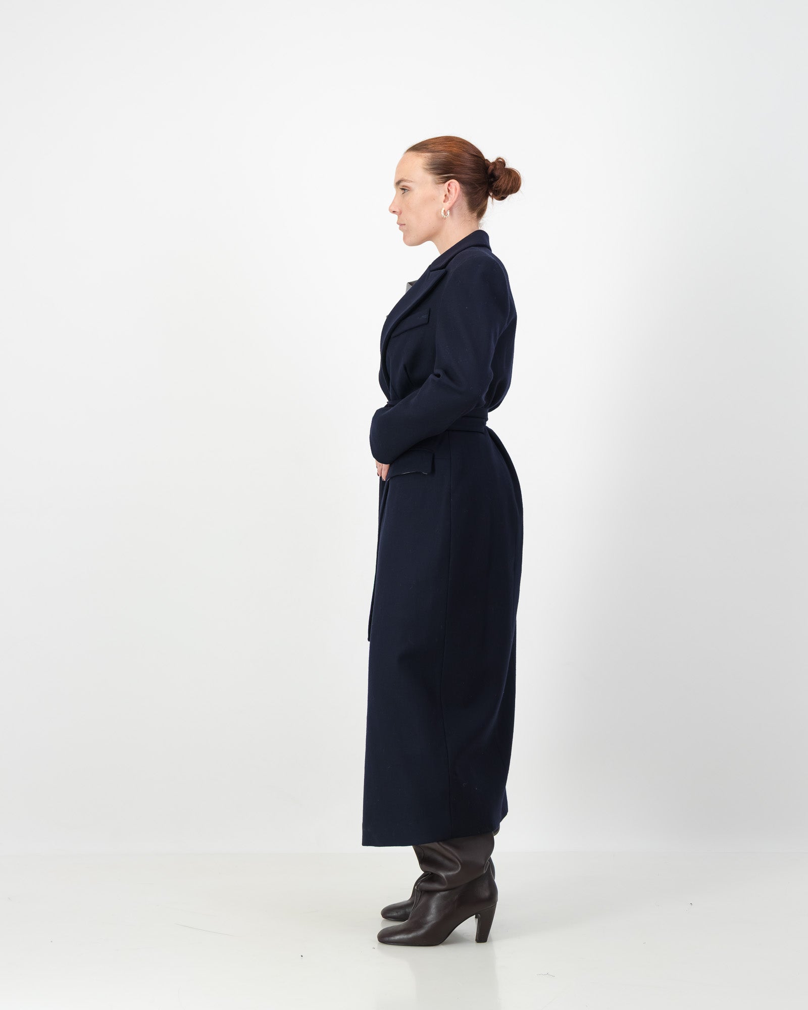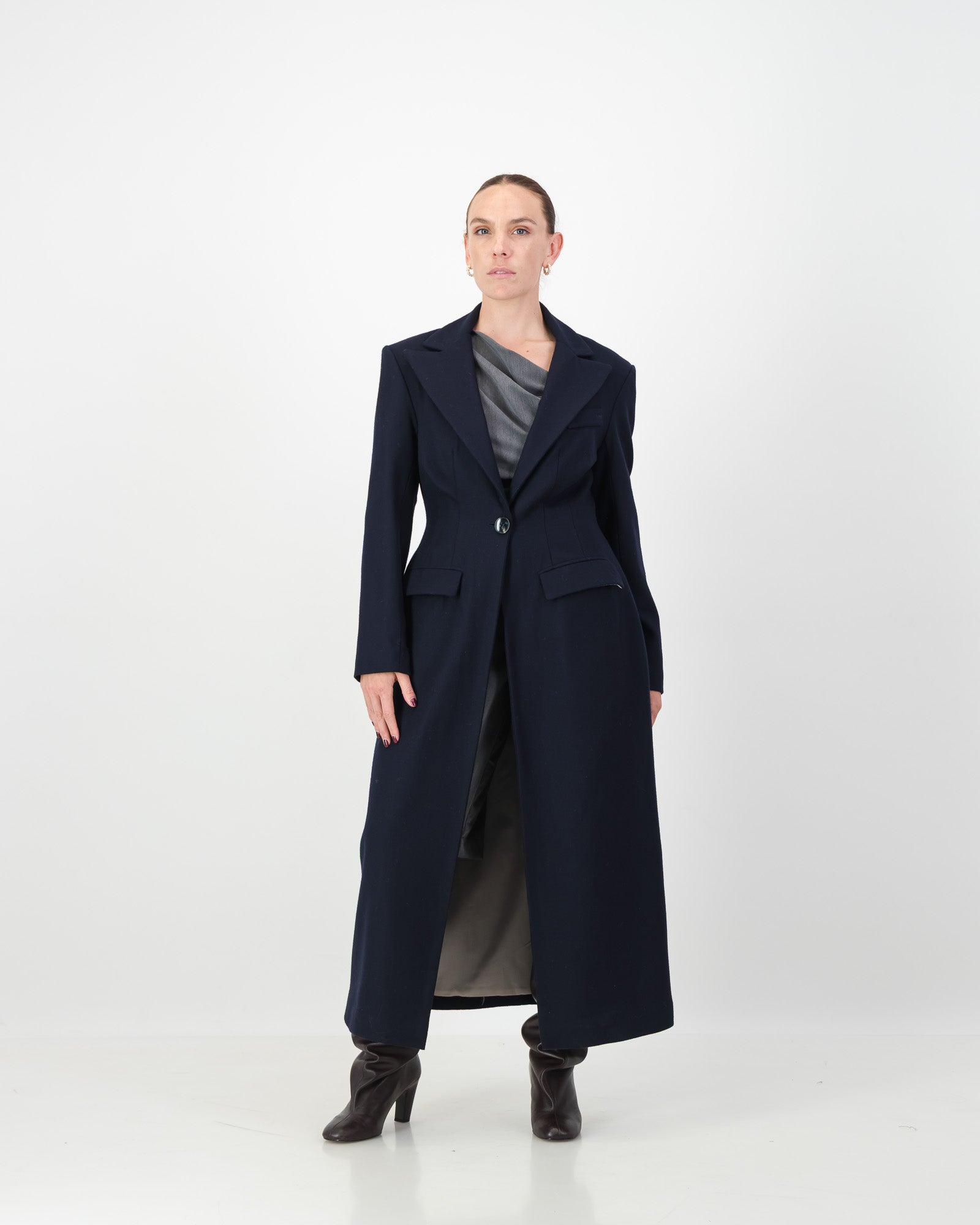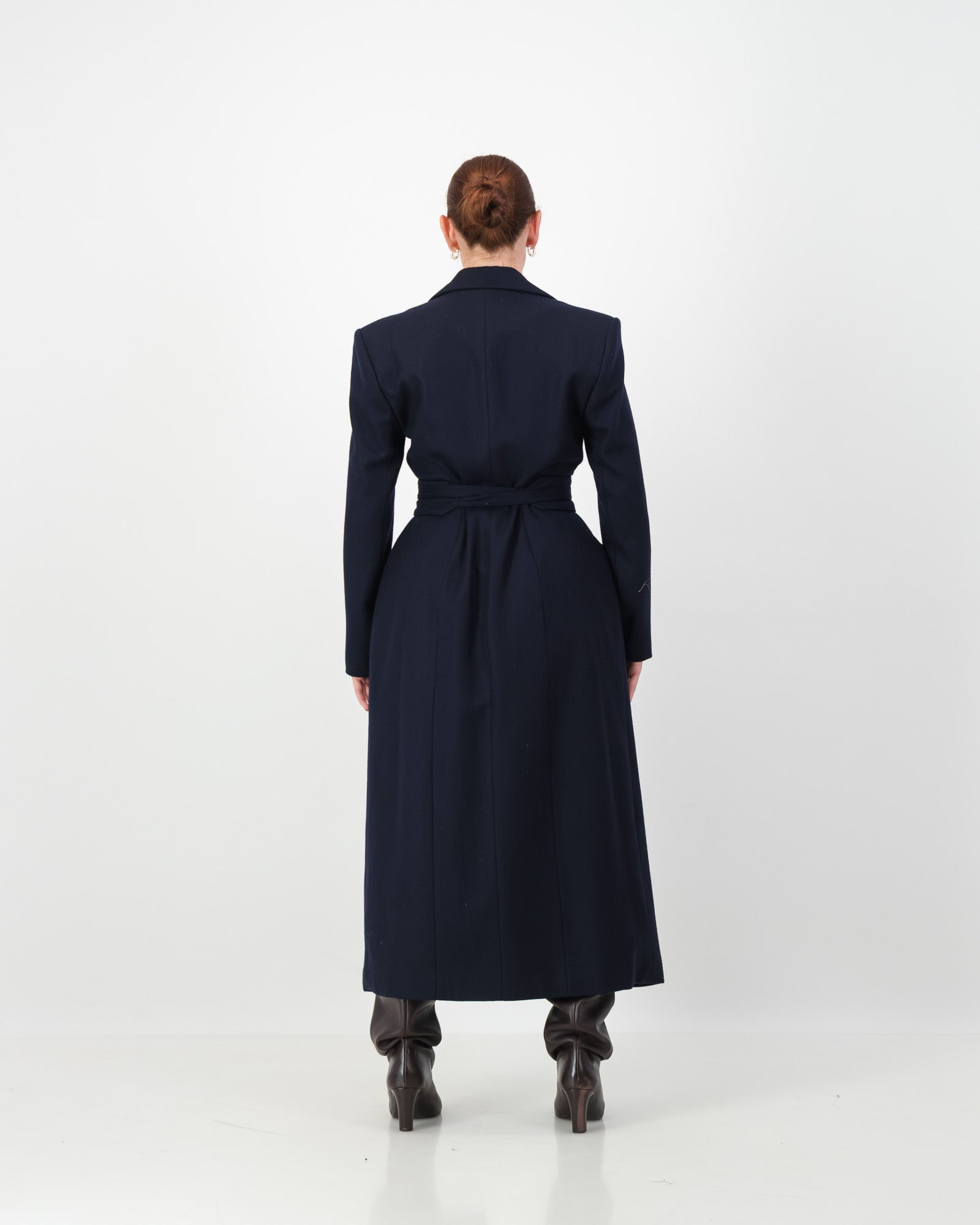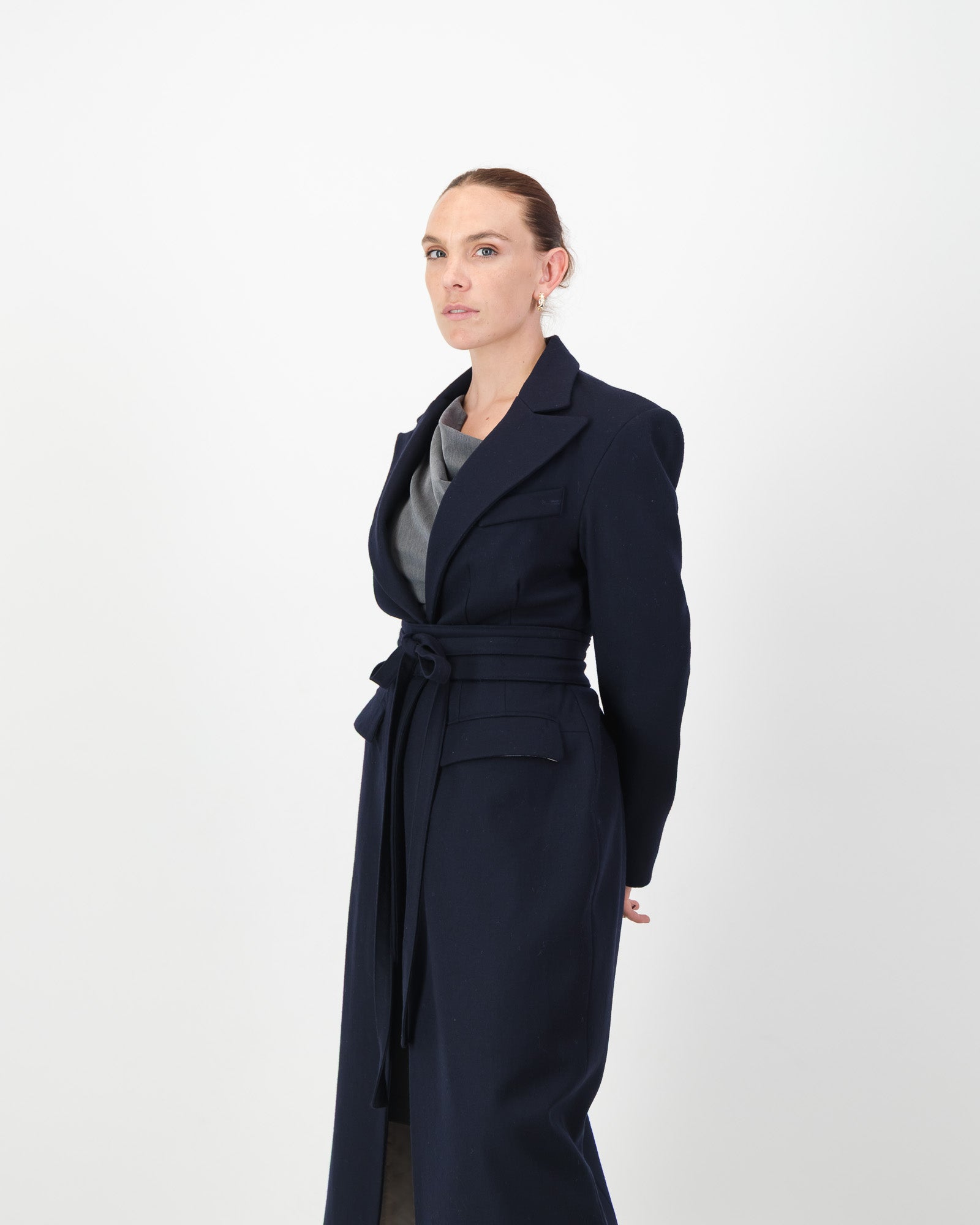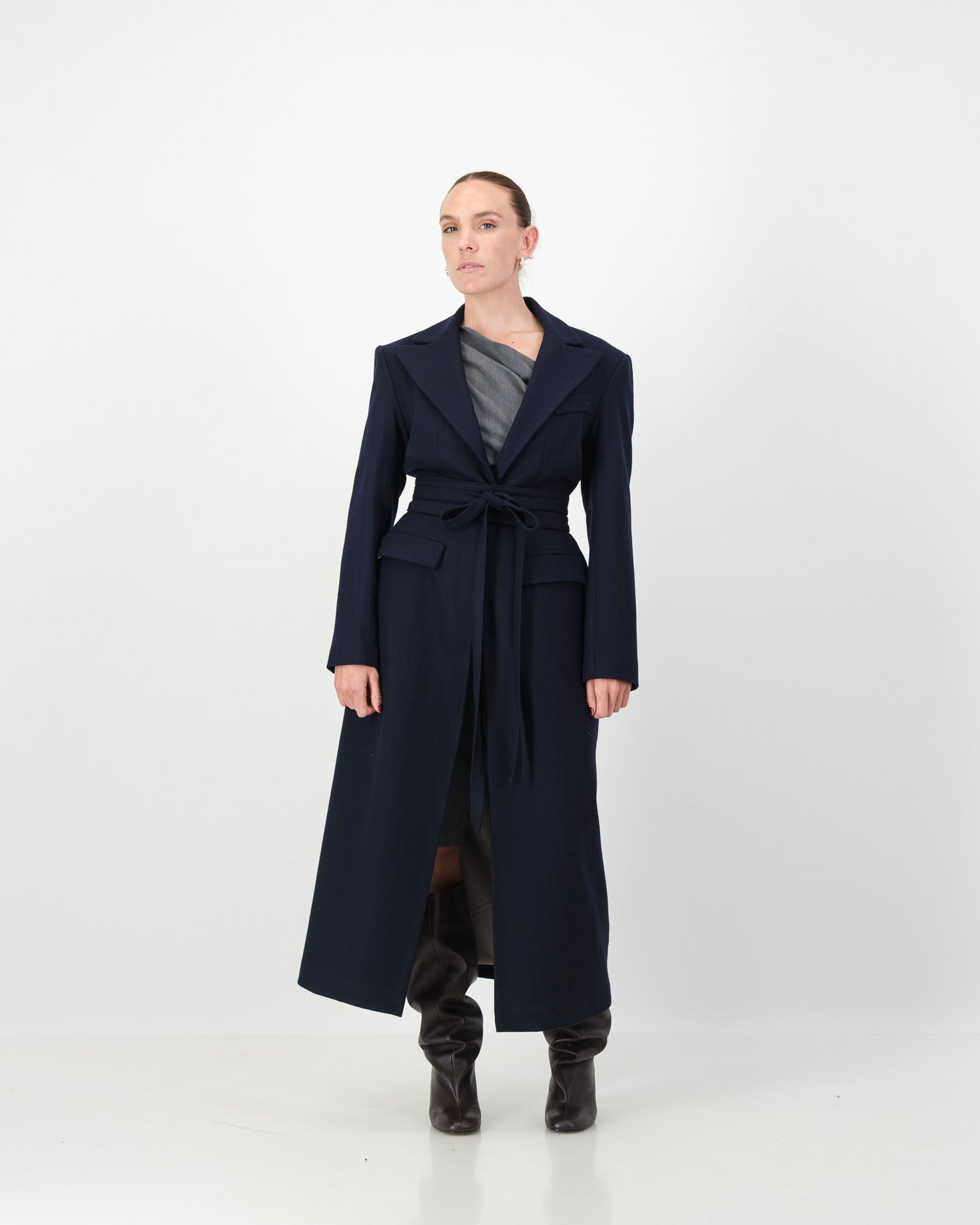 A statement maxi coat with an asymmetric front closure that sculpts the waist and subtly opens at the front to reveal the legs. Designed with bold lapels, boxy shoulders, and a single-button closure. Features two front pockets, a mock welt pocket on the bust, and a wide-to-narrow wrap belt for added shape. Available in black Melton and navy wool.
