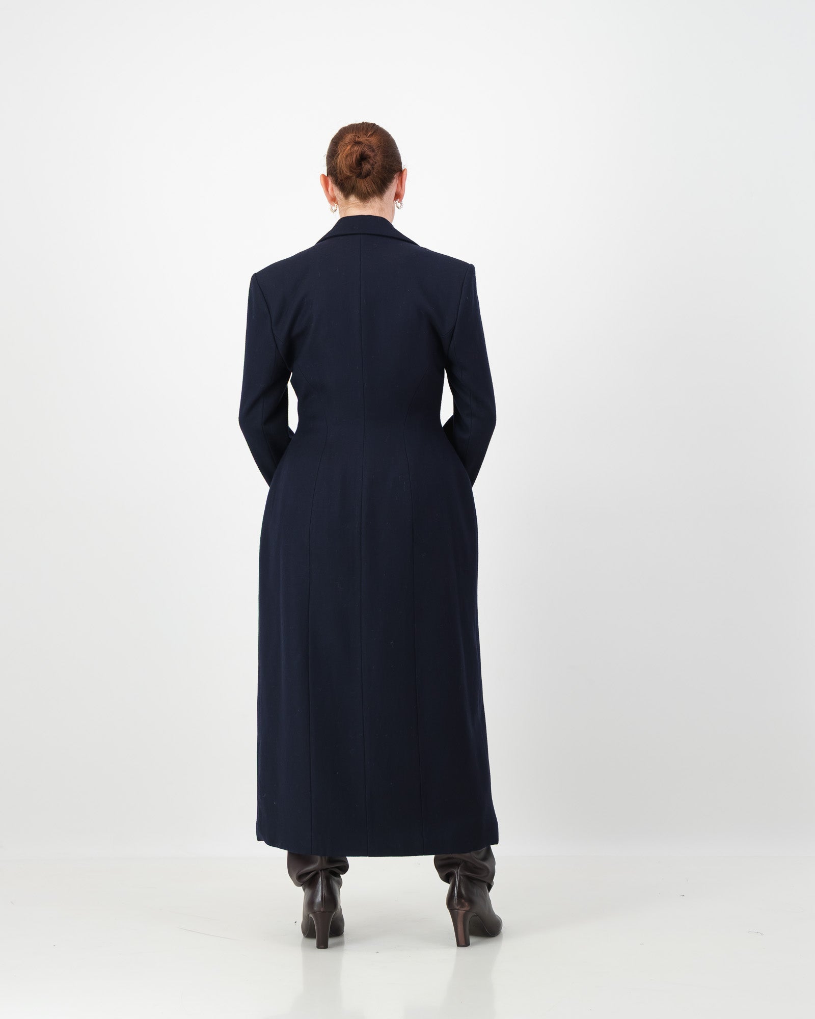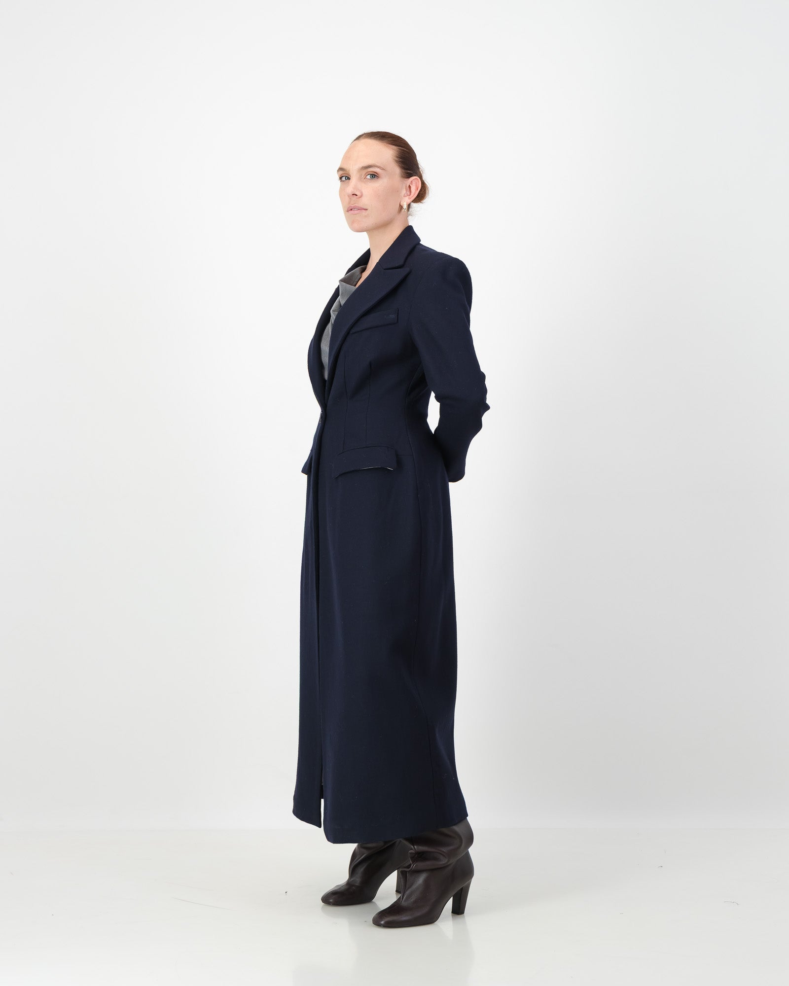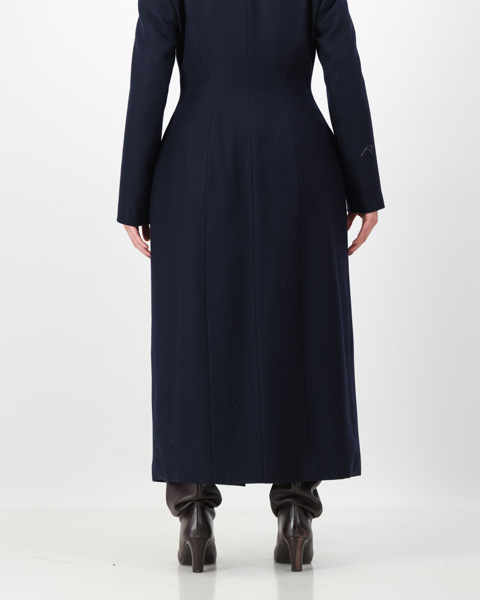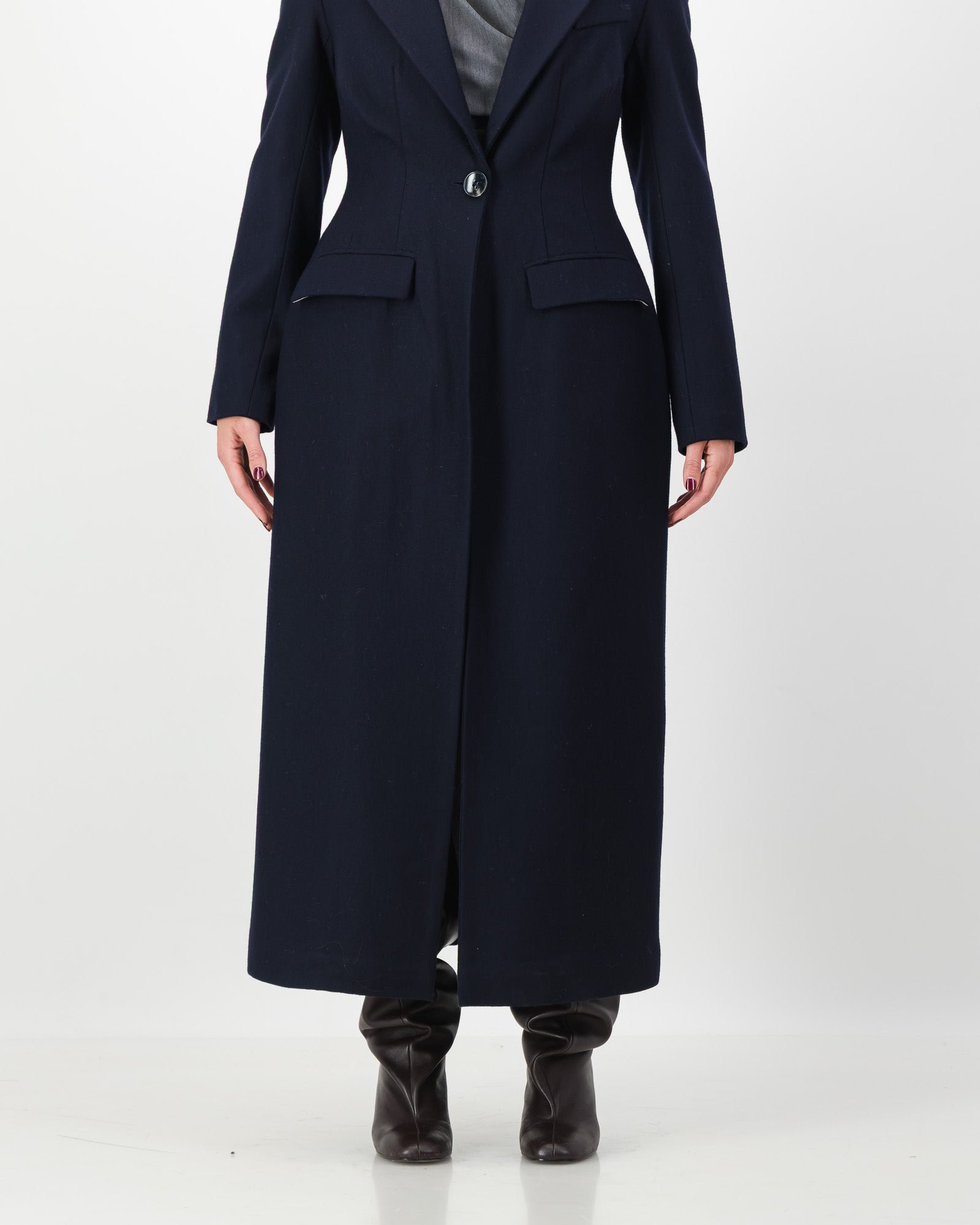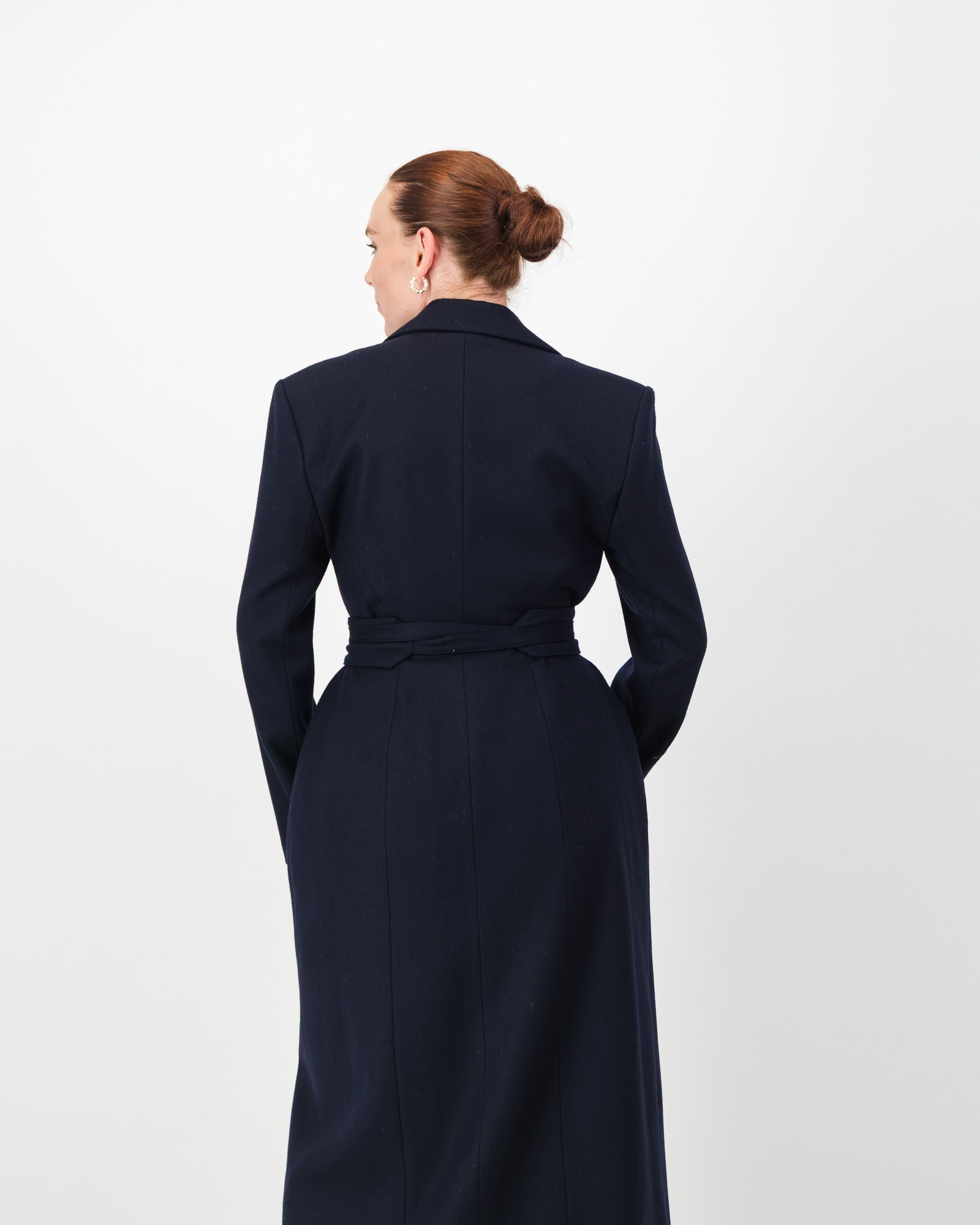 A statement maxi coat with an asymmetric front closure that sculpts the waist and subtly opens at the front to reveal the legs. Designed with bold lapels, boxy shoulders, and a single-button closure. Features two front pockets, a mock welt pocket on the bust, and a wide-to-narrow wrap belt for added shape. Available in black Melton and navy wool.