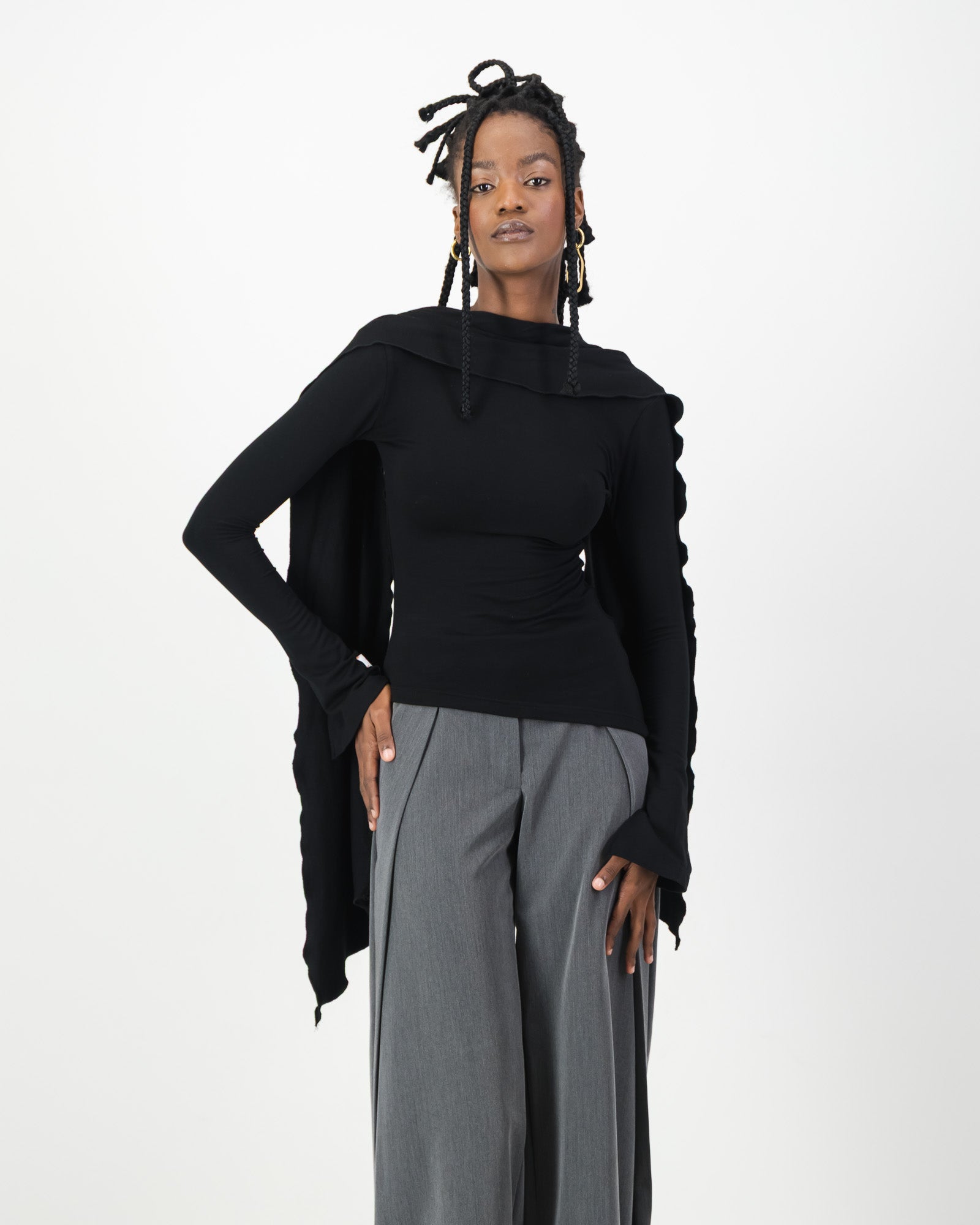 A reversible scarf top with an attached scarf detail sewn into the neckline. Wear it with a high neck and flowing scarf back, or flip it for a scooped front with the scarf wrapped forward. Finished with an asymmetric hem and hand-sewn label on the sleeve. Made from ultra-soft, stretchy unbrushed viscose. Available in cream and black, with burgundy launching soon.