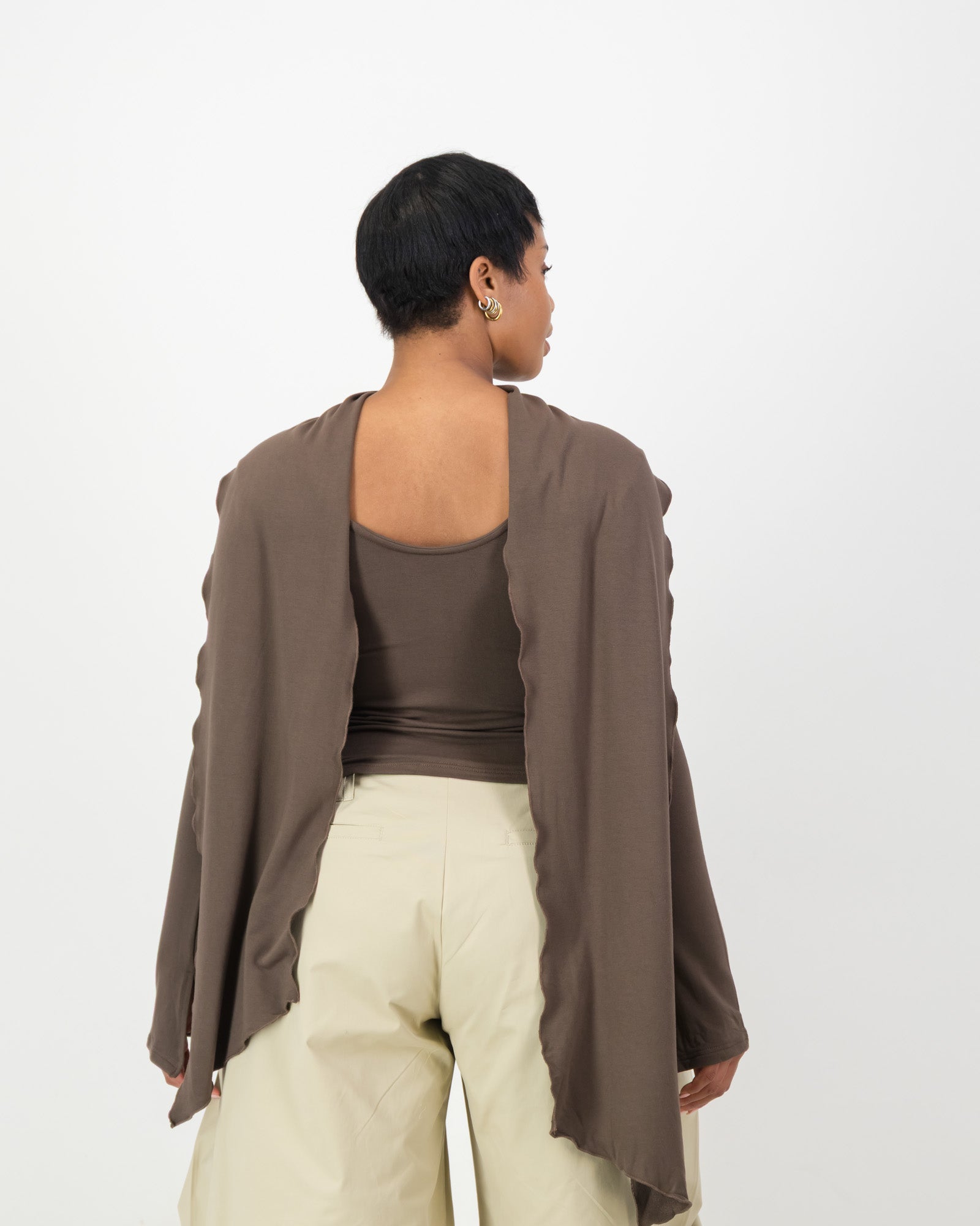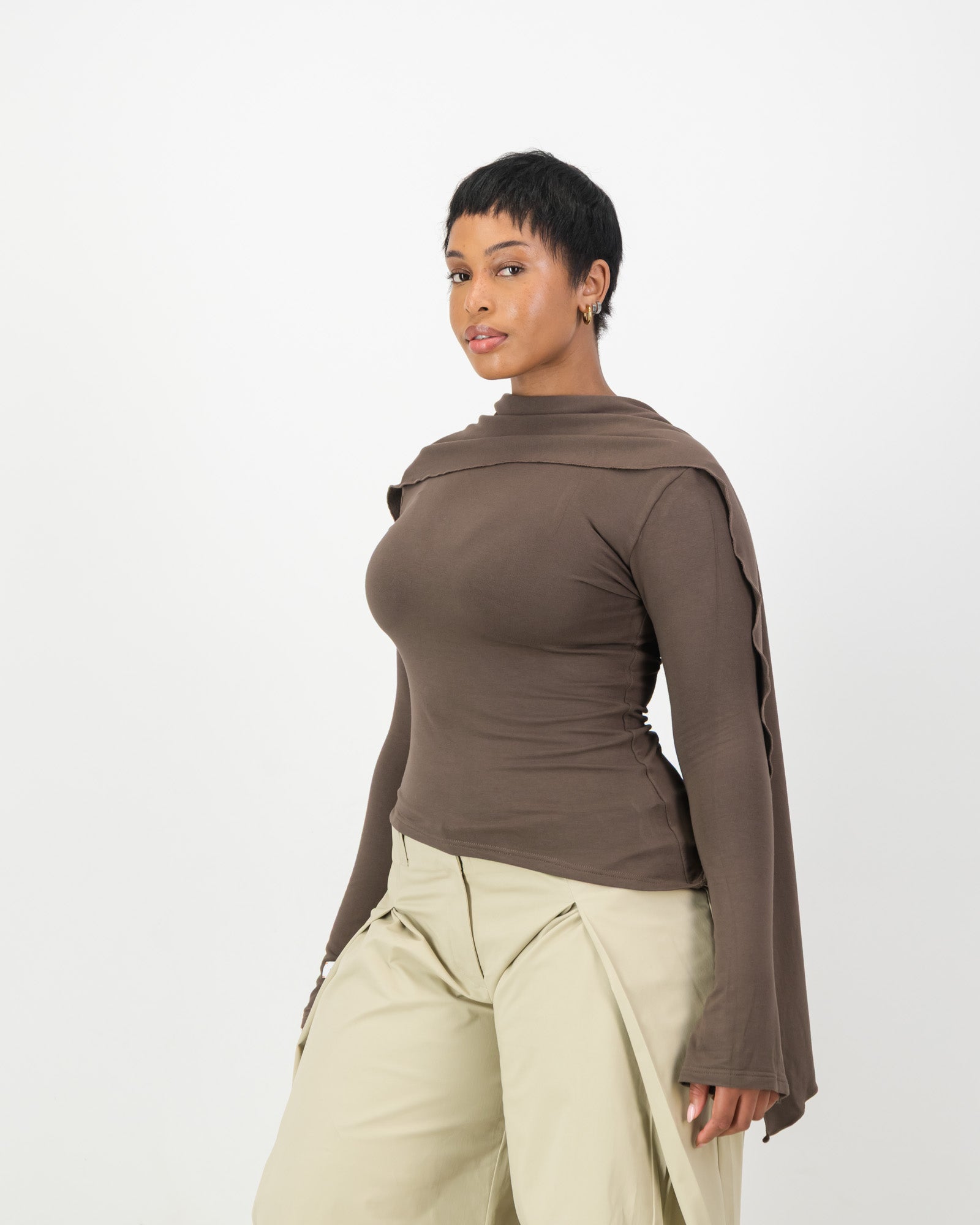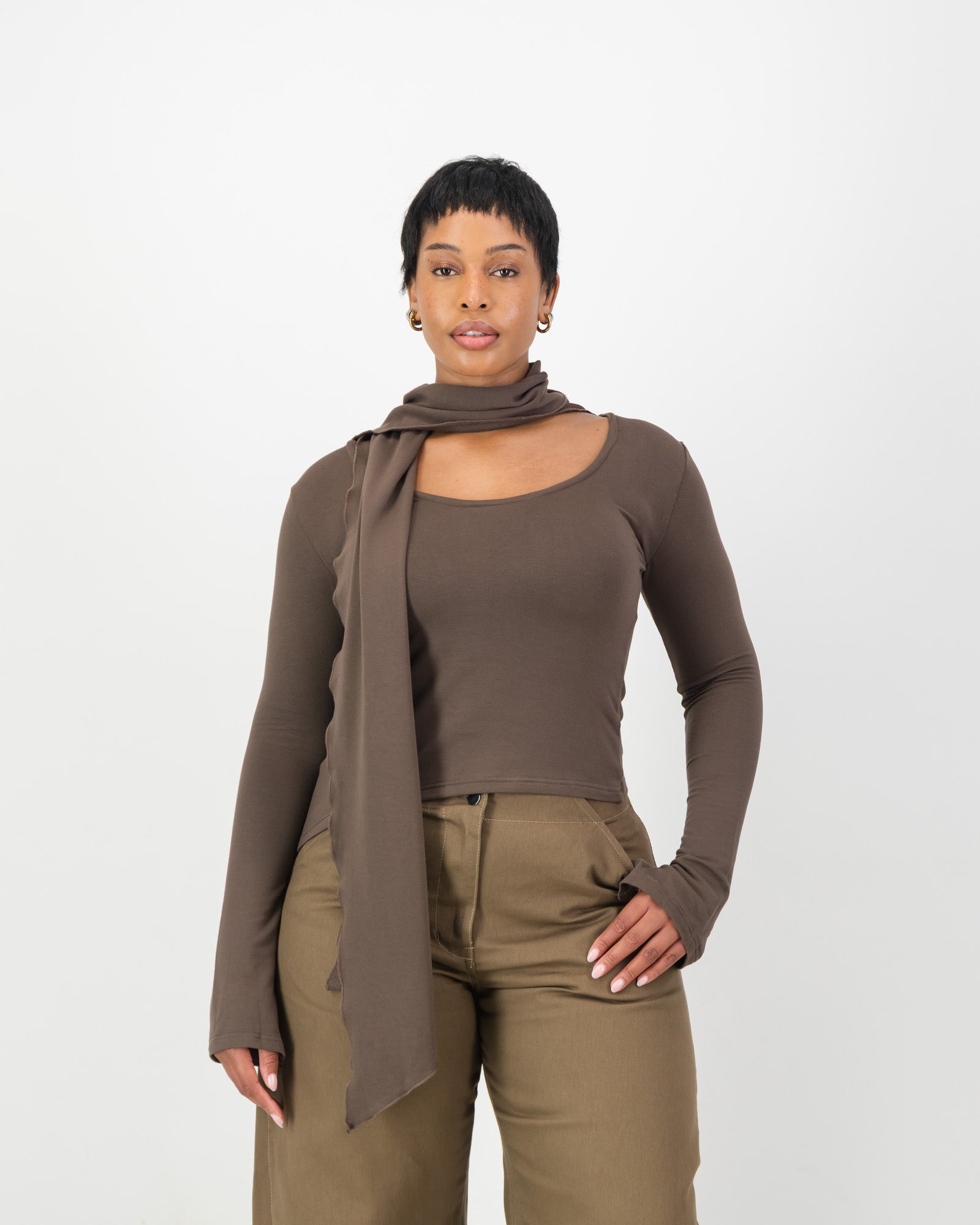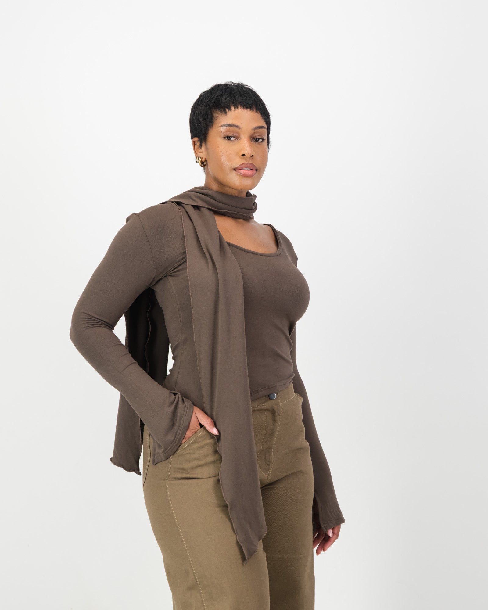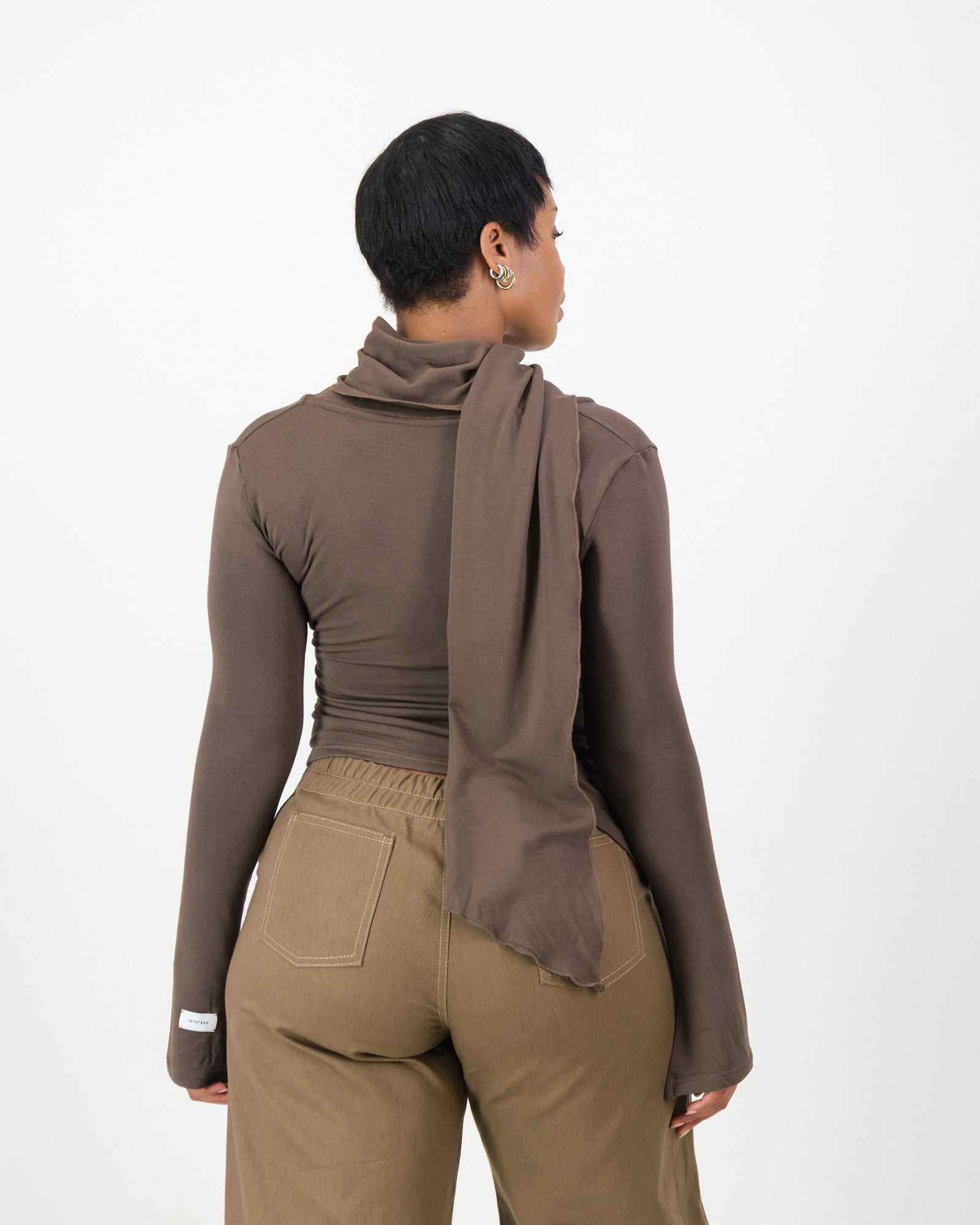 A reversible scarf top with an attached scarf detail sewn into the neckline. Wear it with a high neck and flowing scarf back, or flip it for a scooped front with the scarf wrapped forward. Finished with an asymmetric hem and hand-sewn label on the sleeve. Made from ultra-soft, stretchy unbrushed viscose. Available in cream and black, red and mocha.
