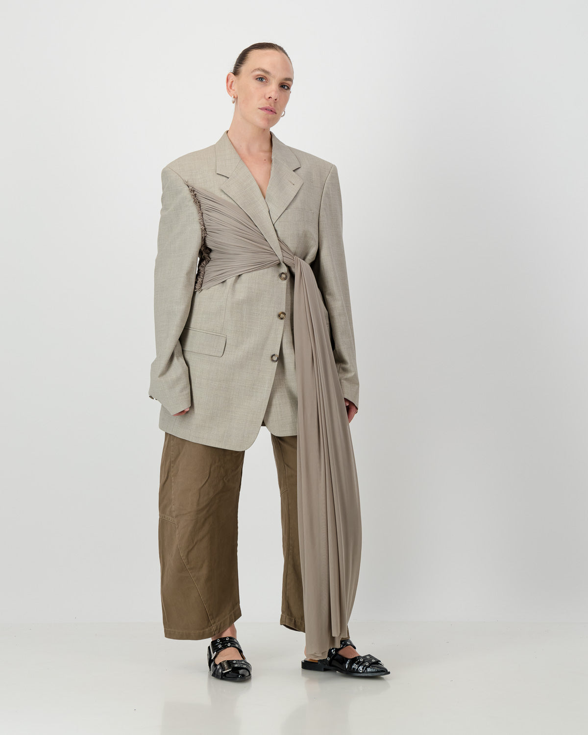 The Wrap Blazer is an upcycled, one-of-a-kind piece that features two long mesh panels on the left side, which can be styled in a variety of ways for a personalized look. The lapels feature 2 gaps, which allow the mesh to be threaded through, creating multiple styling options that drape beautifully on the body.